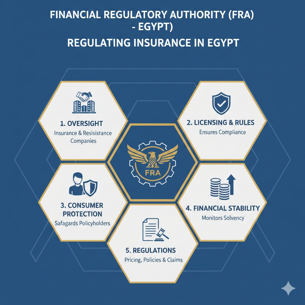 The Financial Regulatory Authority (FRA) is responsible for regulating and supervising all insurance activities in Egypt.