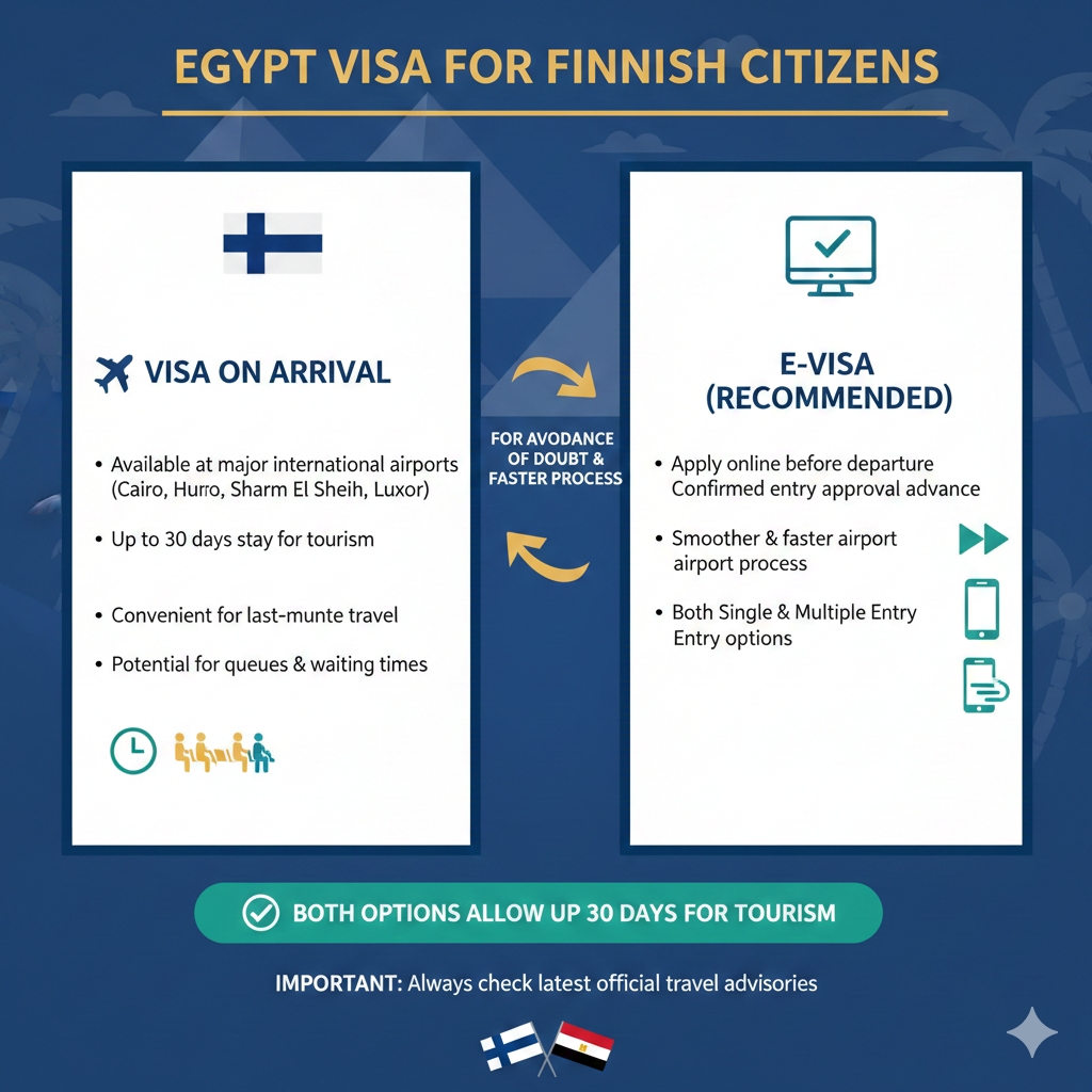 Travelers from Finland can receive a visa upon arrival at major airports and certain entry points in Egypt. This option generally allows a stay of up to 30 days.