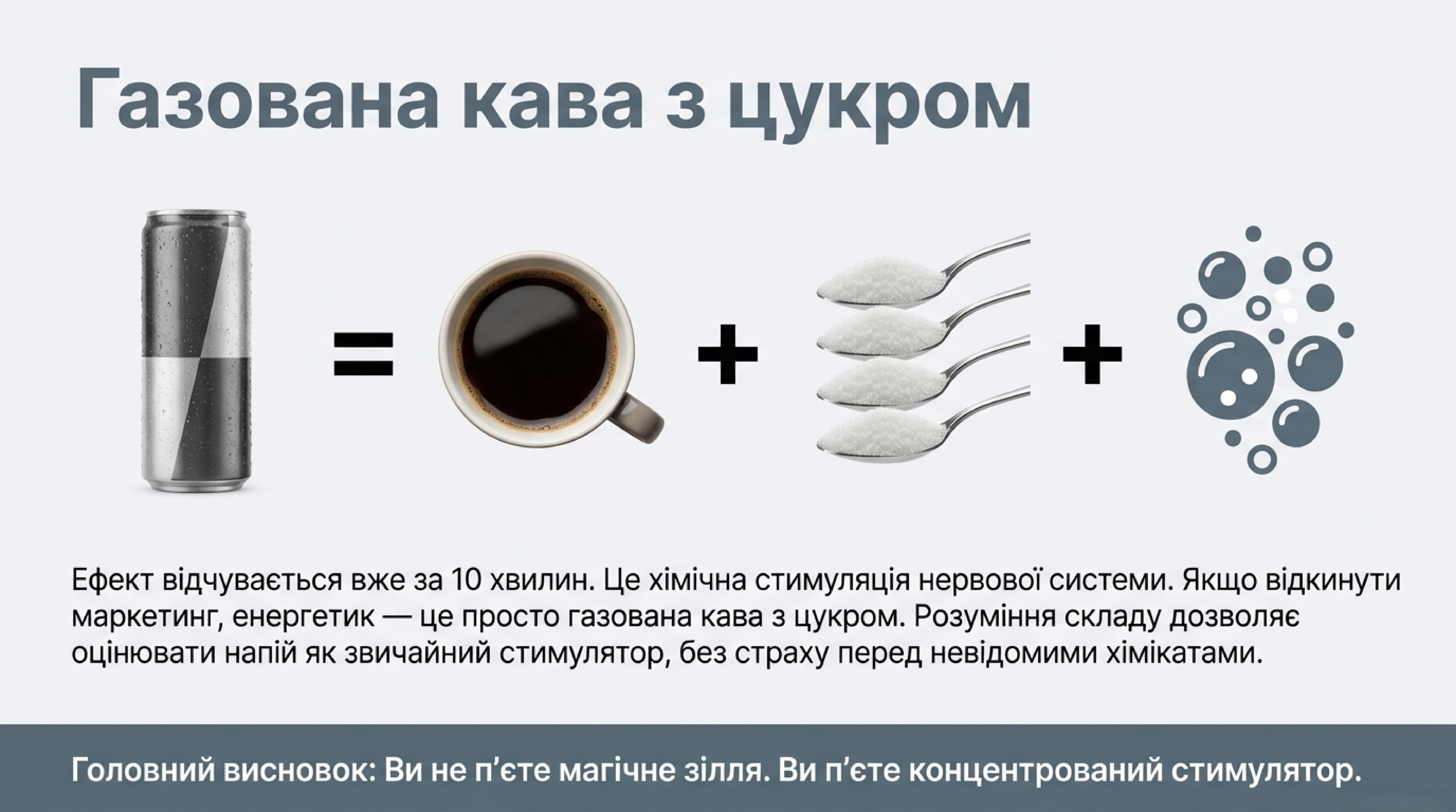 Аналітичне резюме: Чому це важливо? Розуміння того, що енергетик — це просто «газована кава з цукром», дає змогу відкинути упередження про містичну шкоду й оцінювати напій як звичайний стимулятор.