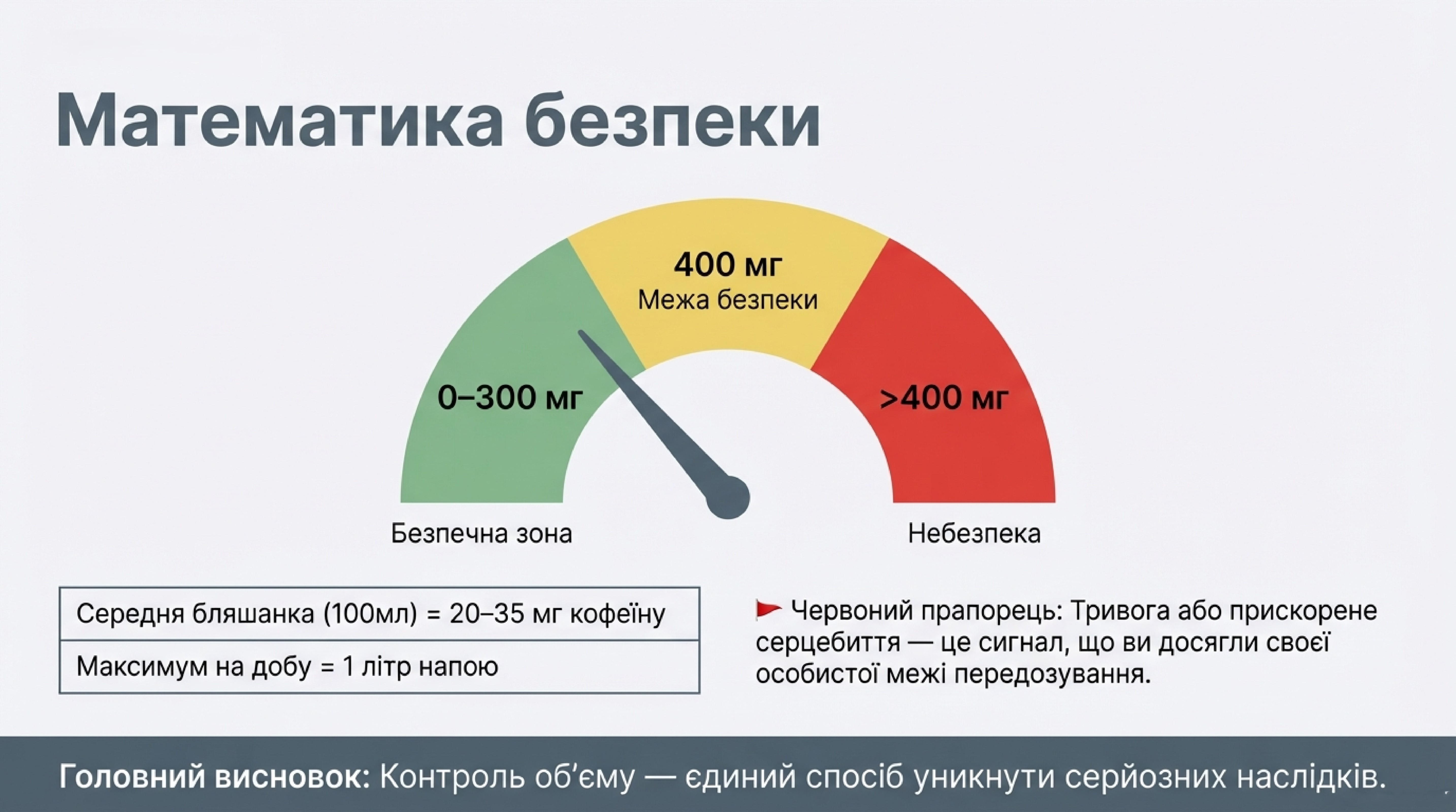 Наука встановлює чіткі межі. Для здорової дорослої людини безпечним обсягом вважається 400 мг кофеїну на добу (деякі джерела радять обмежитися 300 мг).