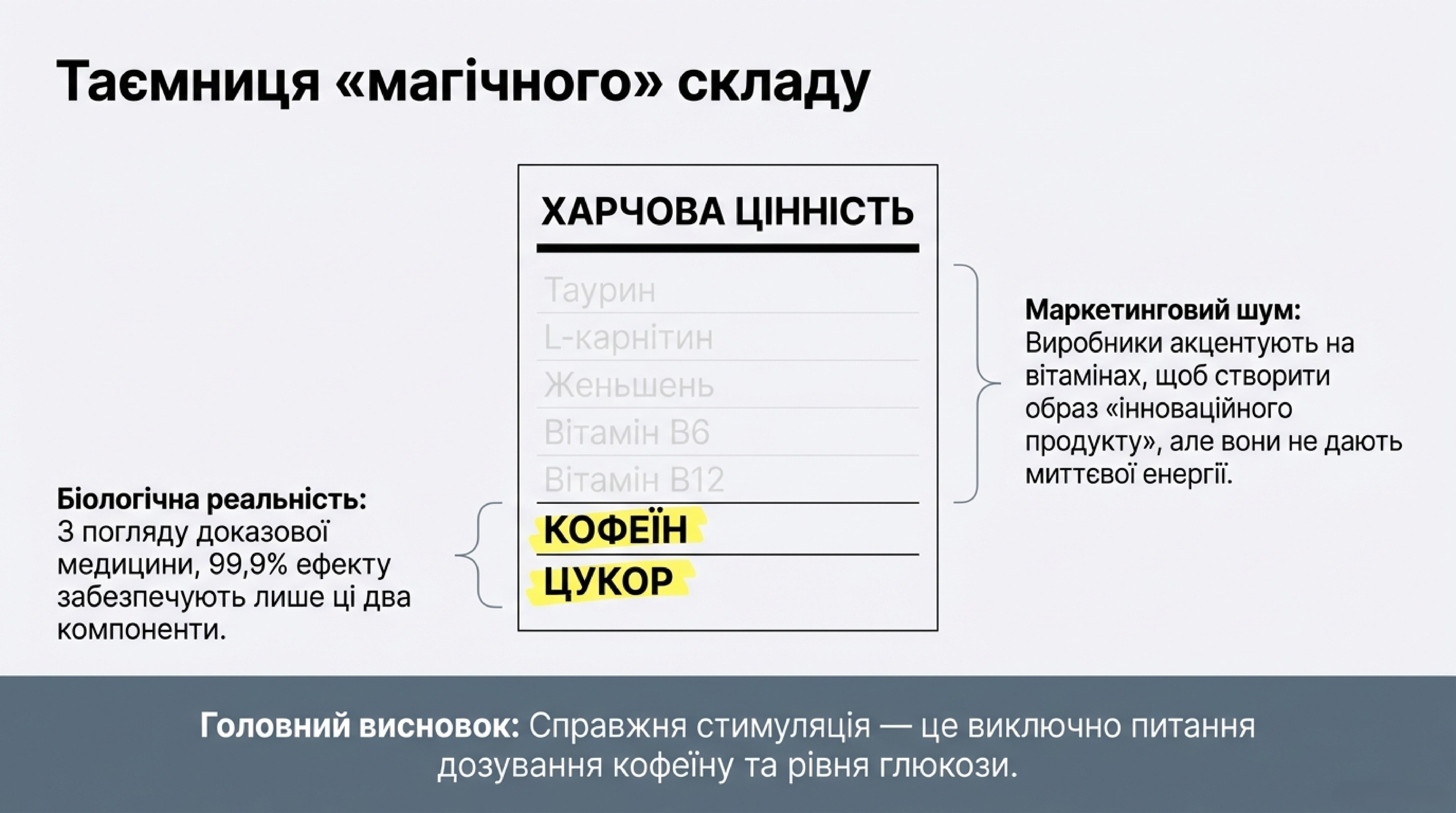 Виробники витрачають мільйони, аби переконати нас в унікальності своїх формул. На етикетках ми бачимо таурин, L-карнітин, глюкуронолактон та вітаміни групи B. Проте з погляду доказової медицини, 99,9% ефекту напою забезпечують лише два складники: кофеїн та швидкі вуглеводи (цукор).