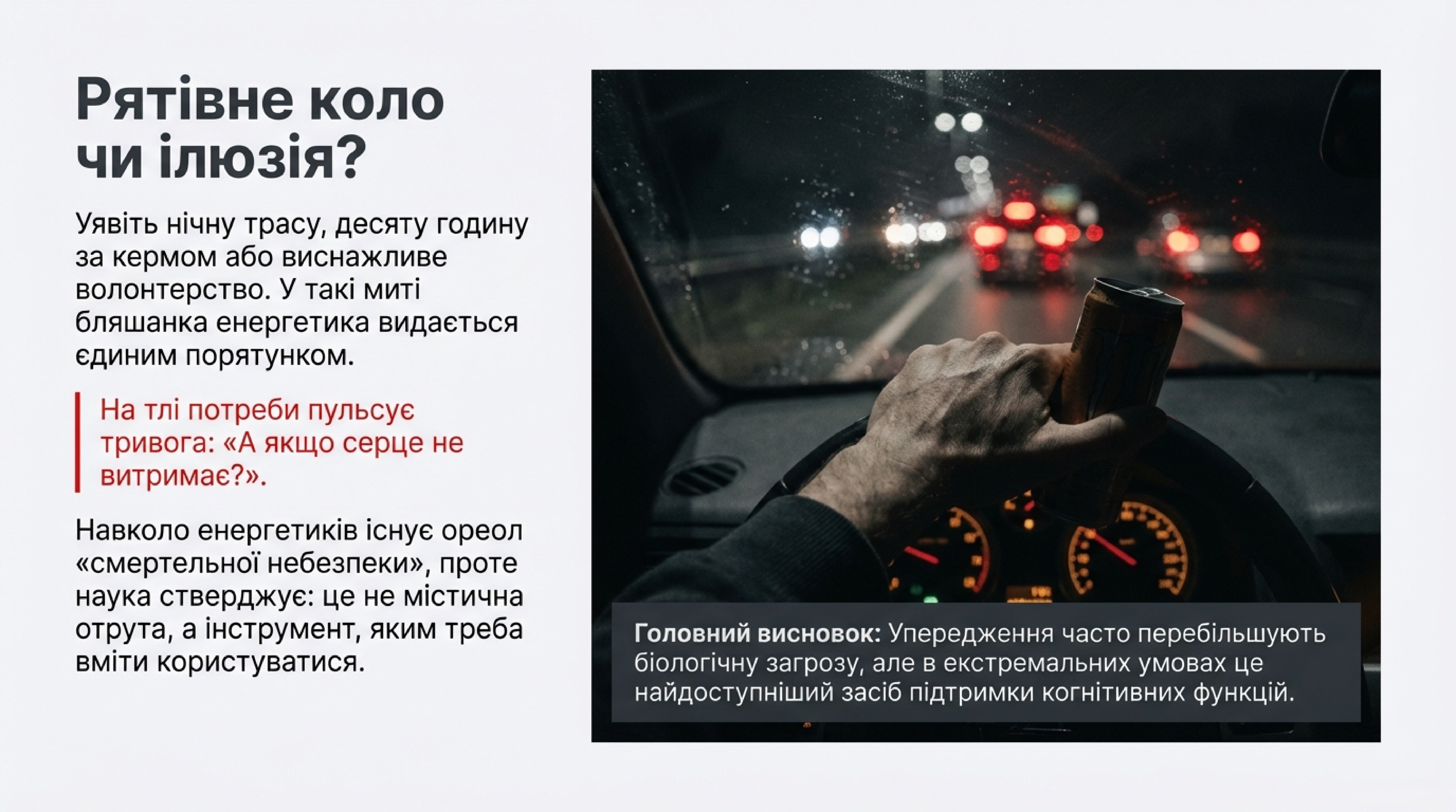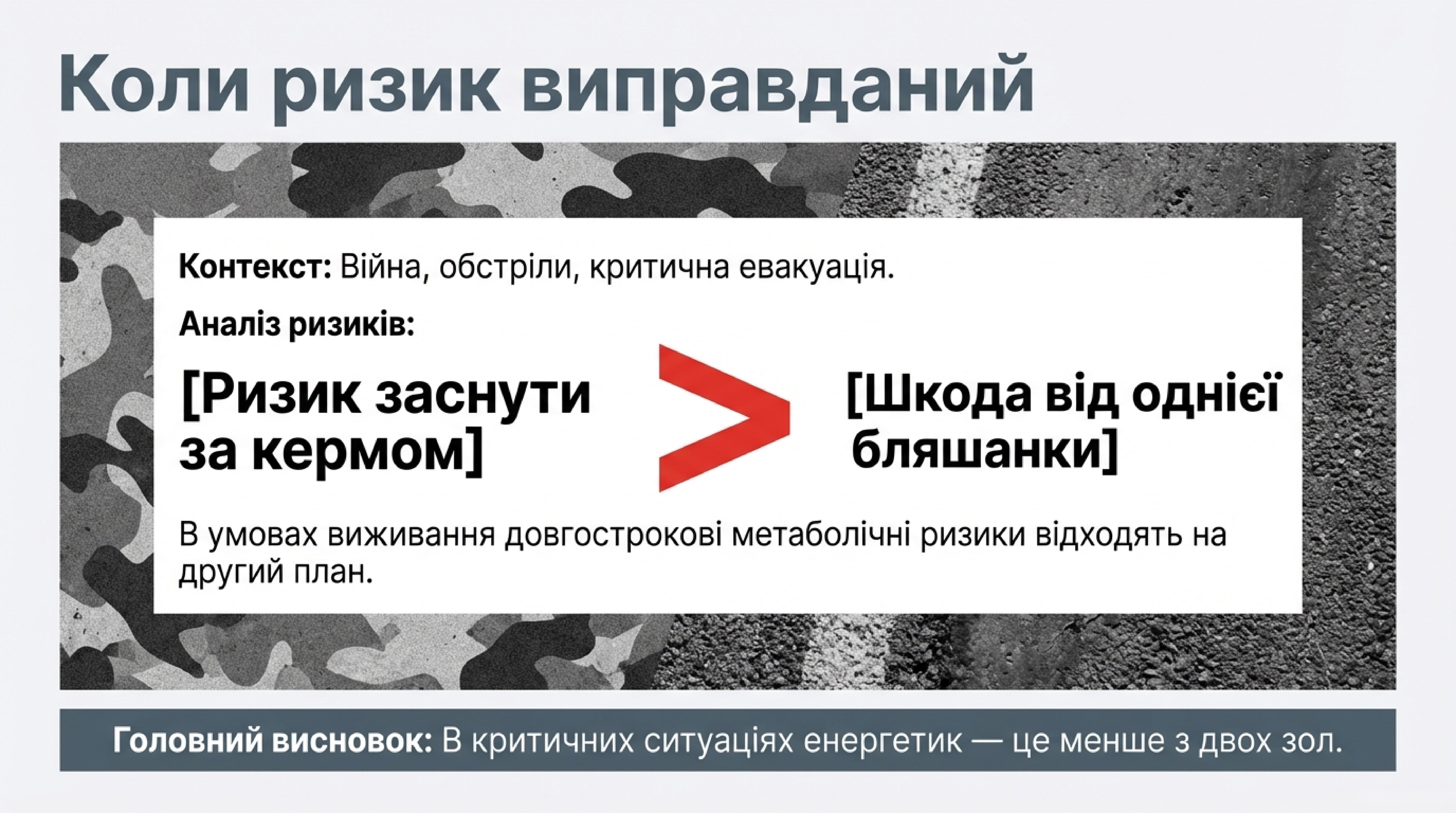 Енергетик — це інструмент, ефективність якого залежить від контексту. В умовах війни чи виснажливого волонтерства, де ціною помилки є життя, побоювання щодо шкоди від напою видаються недоречними. Ризик від однієї бляшанки є мізерним порівняно з небезпеками на передовій.