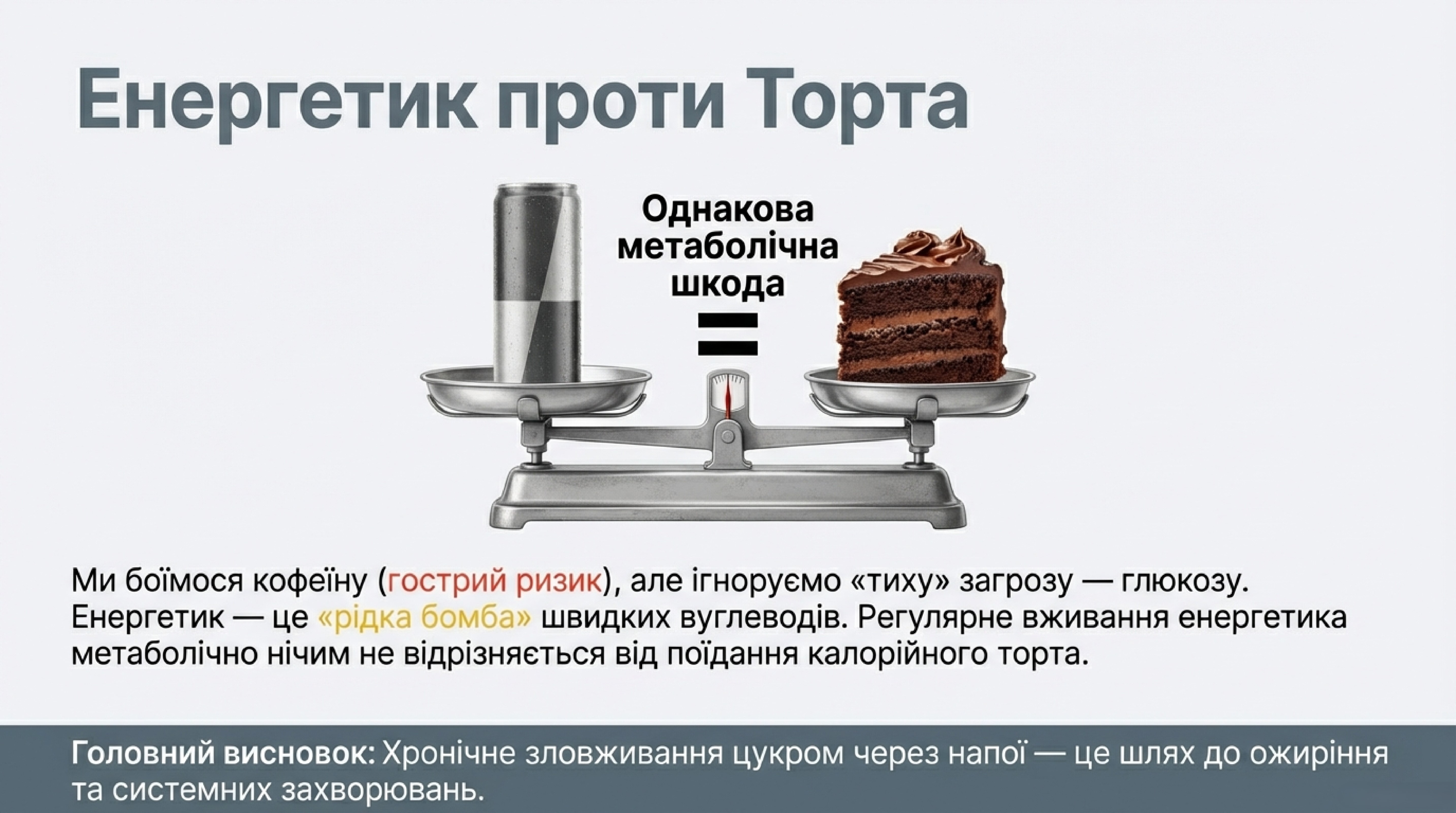 З погляду довгострокового впливу на обмін речовин, регулярне вживання енергетика нічим не відрізняється від споживання калорійного торта. Проте є суттєва різниця: кофеїн становить гостру, миттєву небезпеку в разі передозування, тоді як цукор руйнує організм непомітно упродовж років.