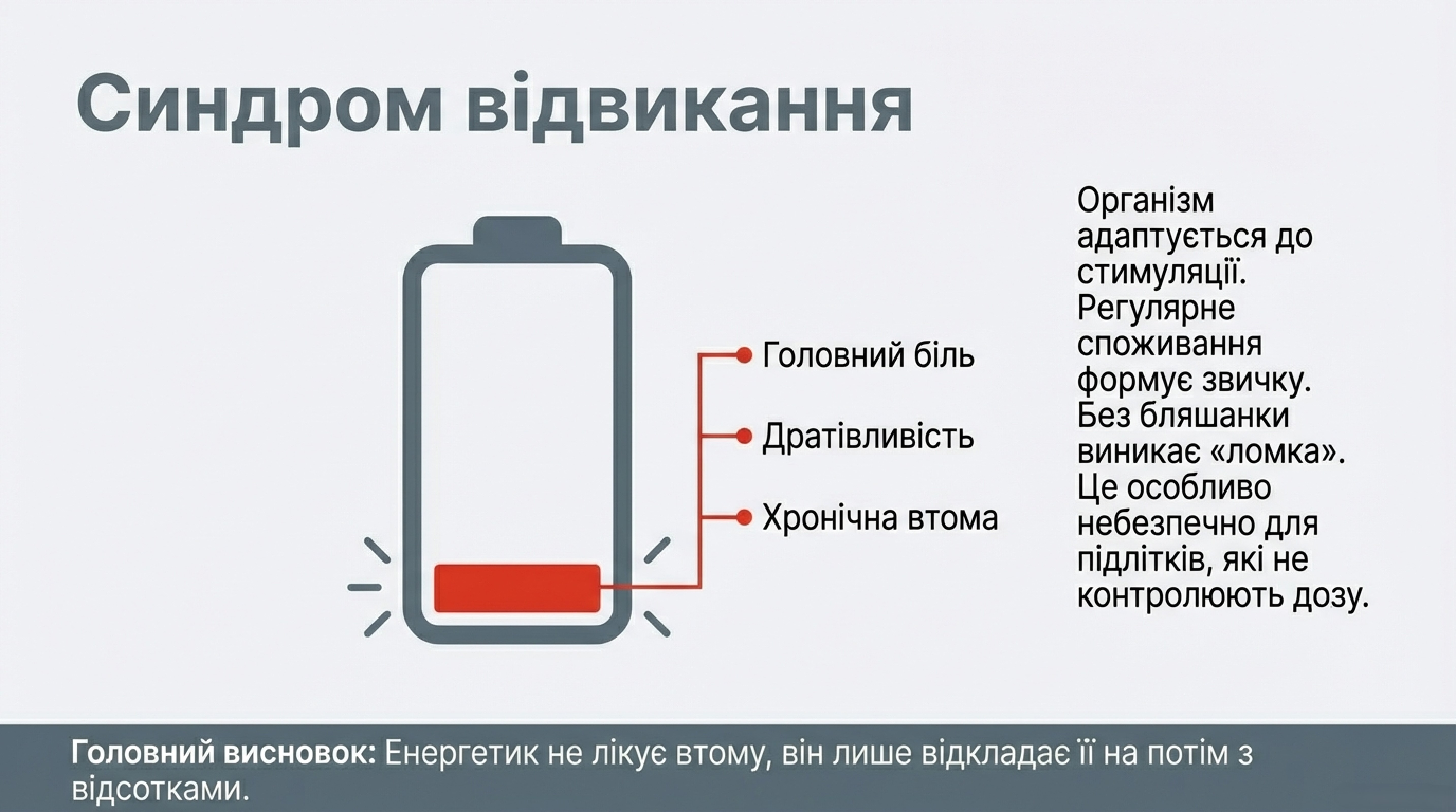 Окрім гострих станів, існує «синдром відвикання». Регулярне споживання формує залежність, і за відсутності звичної бляшанки людина потерпає від головного болю, дратівливості та хронічної втоми. Особливо вразливими є підлітки, які не здатні контролювати дозу та часто змішують енергетики з алкоголем.