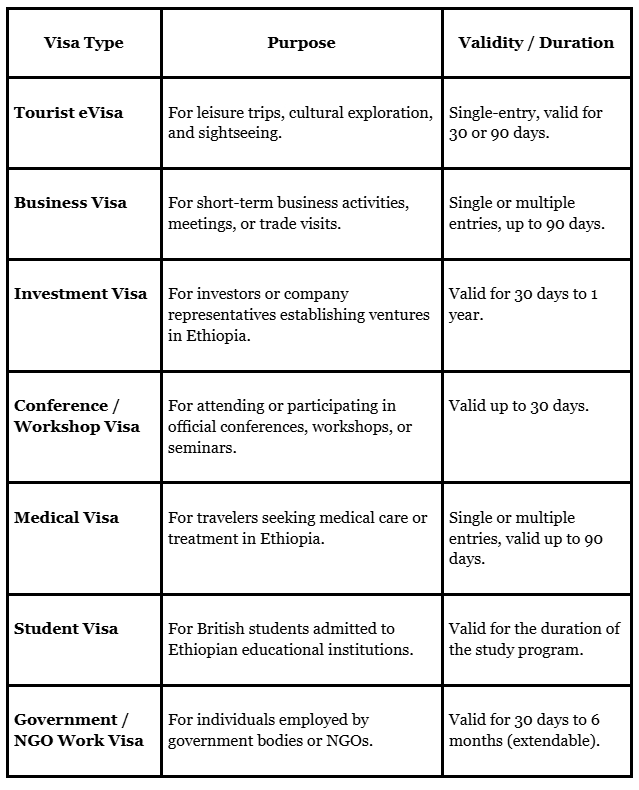 Ethiopia offers various eVisa types for British citizens, depending on the purpose and duration of travel. Each visa type is designed to meet different travel needs, from tourism and business to study and medical treatment. Below is a breakdown of the main Ethiopia eVisa for UK Citizens: