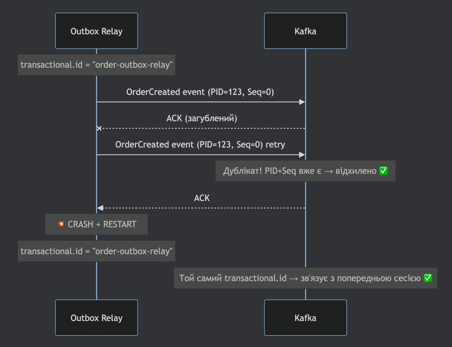 Transactional Producer: (transactional.id) вирішує проблему retry після рестарту — стабільний transactional.id дозволяє Kafka зв'язати нову сесію зі старою та продовжити дедуплікацію.
