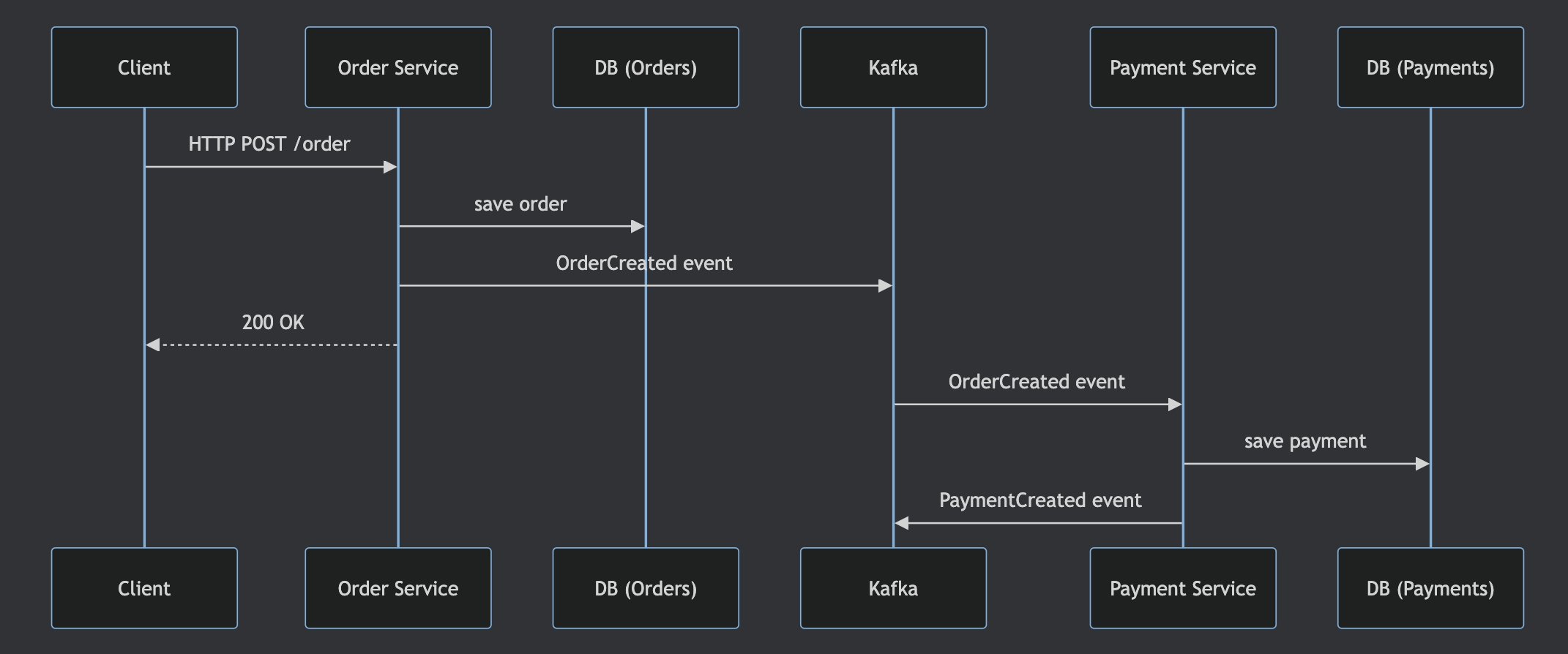 Тому далі розглянемо exactly-once детальніше на прикладі мікросервісної архітектури з Order Service, Payment Service, базами даних та Kafka як брокером між ними.