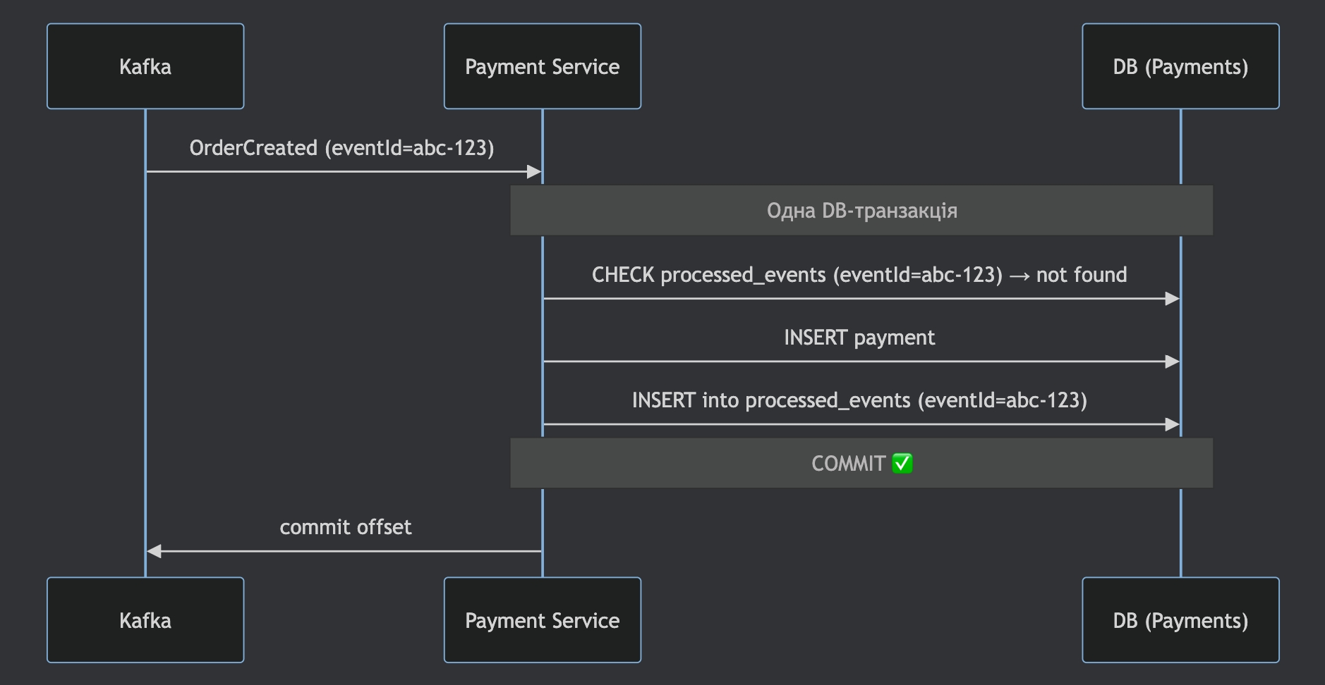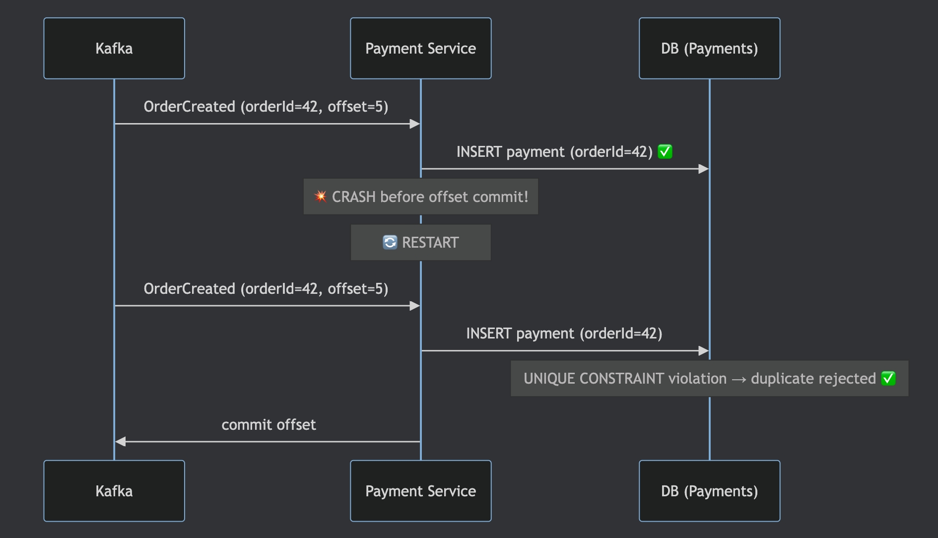 Consumer його прочитав, обробив (записав payment у DB), але впав до коміту offset