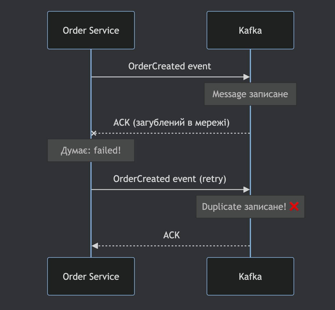 Ідея — consumer сам відповідає за дедуплікацію на своїй стороні. Кожне повідомлення містить унікальний ідентифікатор наприклад orderId і consumer перевіряє чи вже оброблялось це повідомлення.