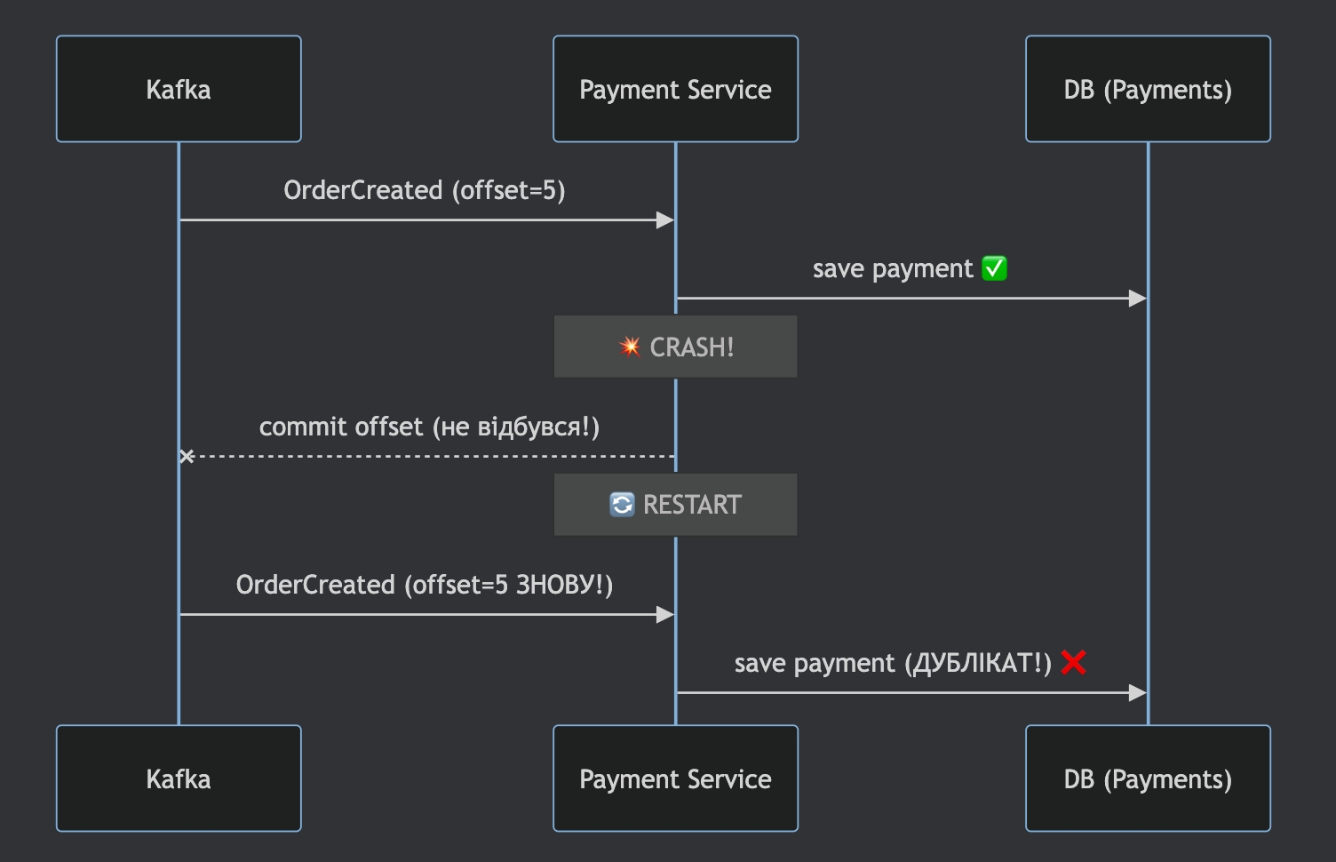 Важливий нюанс: Outbox Producer може впасти після відправки в Kafka, але до позначення event як published. Після рестарту він відправить event повторно. Тобто Outbox Pattern гарантує at-least-once доставку в Kafka, а не exactly-once. І це підводить нас до наступної проблеми.