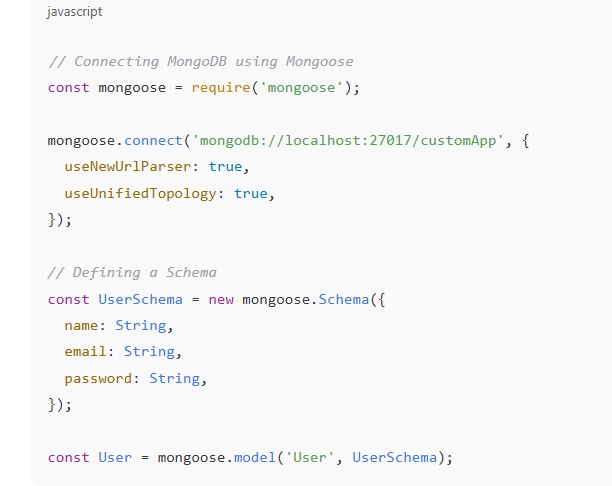 This syntax establishes a user schema for bespoke programs and links MongoDB to the Node.js server.