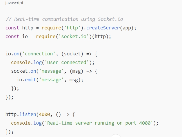 This syntax shows real-time message dissemination via Node.js and Socket.io.