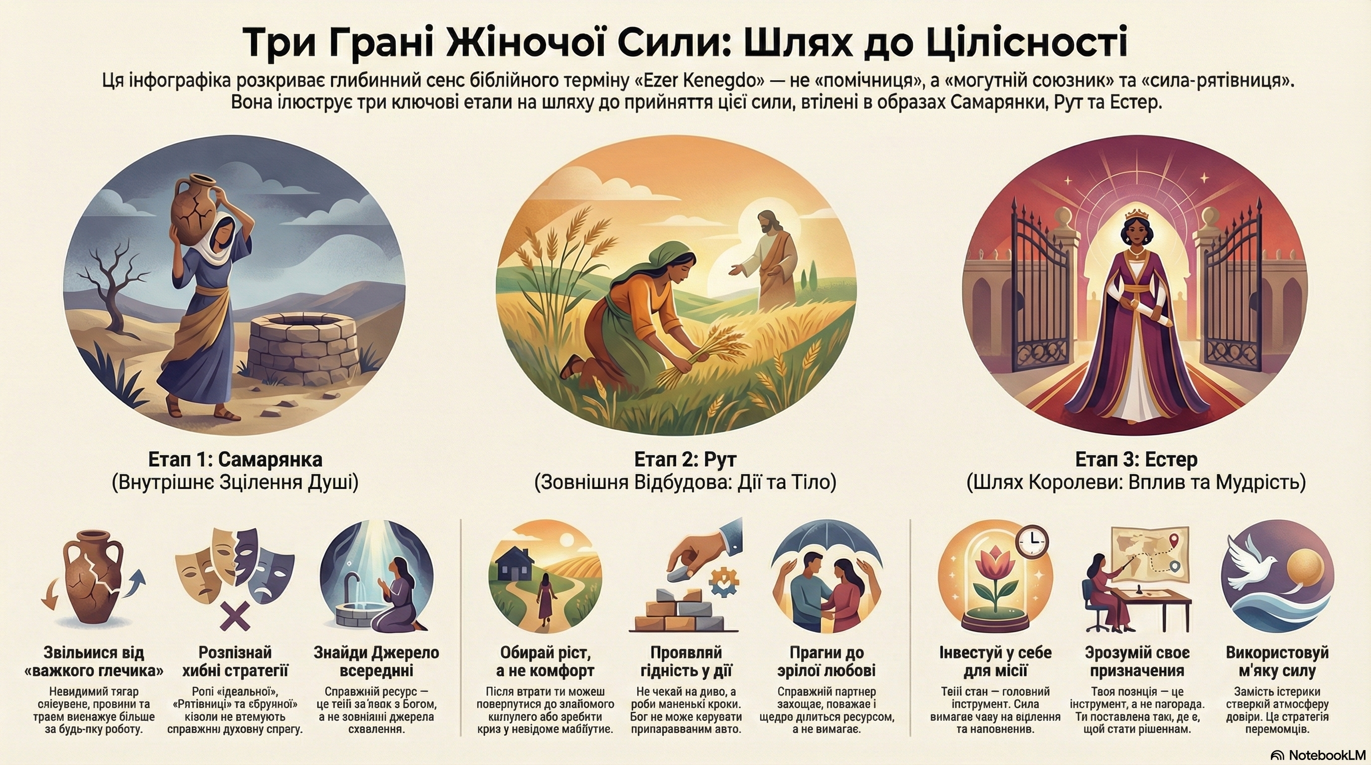 2. Рут (Зовнішня відбудова): Для тих, чий старий світ зруйновано. Це стратегія того, як з нуля збудувати нову долю, зберігши гідність у праці та вразливість у любові.