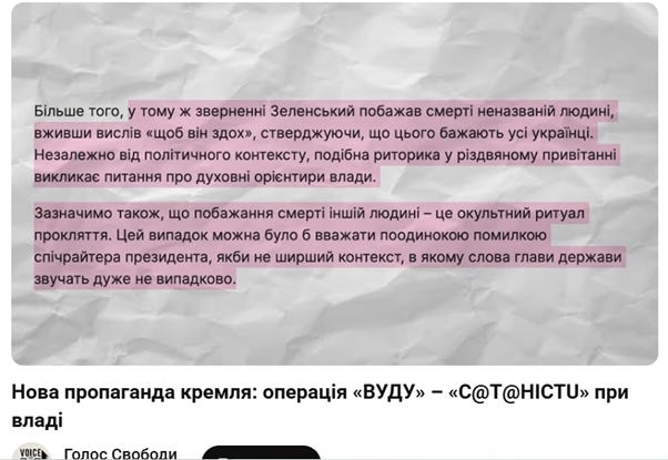 У писульці-горе статті пишуть про «ляльки вуду» у Єрмака, що країною нібито керують окультисти. Це не просто маразм, це технологія москальської пропаганди. НАБУ таких знахідок не підтверджує. Їхній «доказ» — цитата якого підозрюють у державній зраді Дубінського.