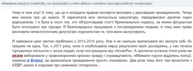 Під її авторством на порталі «ГОВОРИ!» (Вільне слово), де вона, порушуючи презумпцію невинуватості, грубо висловлює своє зневажливе, упереджене ставлення до Руху «АЛЛАТРА» в Україні і визнає, що є тією людиною, яка активно протягом 7 років лобіювала кримінальне переслідування його учасників в Україні, а потім ще складала експертні висновки і «обґрунтовувала статті кримінального кодексу», за якими оголошувалися підозри, що є неприпустимим втручанням у хід досудового розслідування. Зі статті також випливає, що перешкоджанню законній діяльності громадської організації передувала 5-річна «важка робота» позапроцесуальним способом правоохоронців НПУ та Департаменту захисту національної державності СБУ, в той час як офіційне розслідування на той момент тривало всього 1,5 року!