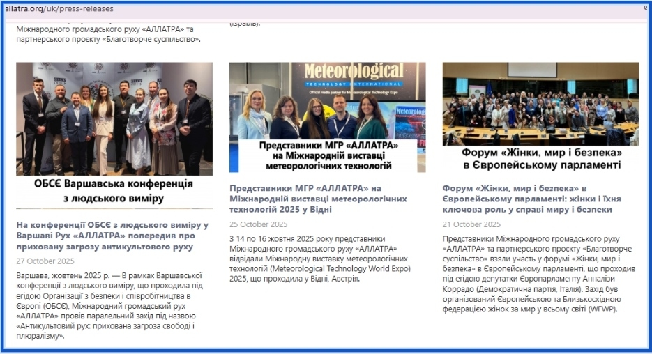 Рух „АЛЛАТРА“ підтримує всі міжнародні зусилля, спрямовані на припинення збройної агресії проти України, а також на забезпечення справедливості, відновлення прав усіх постраждалих та повної компенсації заподіяної шкоди.»