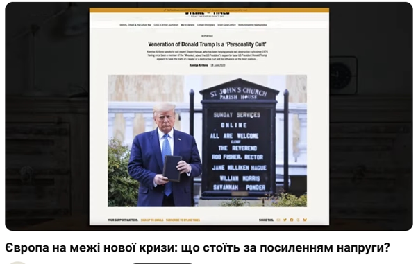 А тепер ще один цікавий факт, який показує, що це невипадковість. Давайте подивимося, що ще 18 червня 2020 року на ресурсі Byline Times вже була опублікована стаття. Про що б ви думали? Вшанування Дональда #Трамп культ особистості. І тут ми бачимо, як все сходиться.