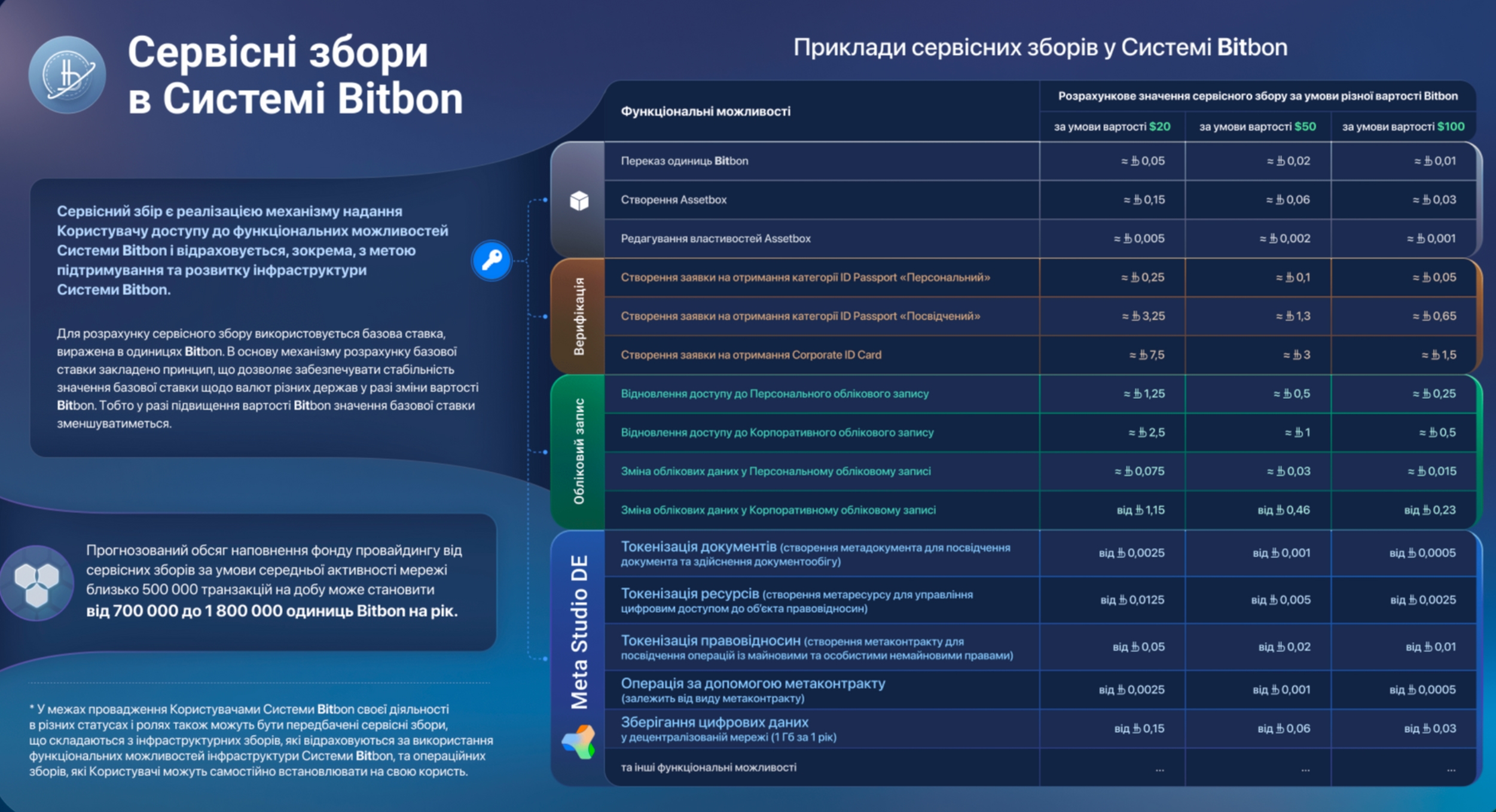 Кожна операція в екосистемі Bitbon починаючи від верифікації та закінчуючи підписанням договорів по передачі прав на майно, супроводжуються сервісним збором в Bitbon. Загалом передбачено понад 500 різних сервісних зборів для приватних та бізнес користувачів.