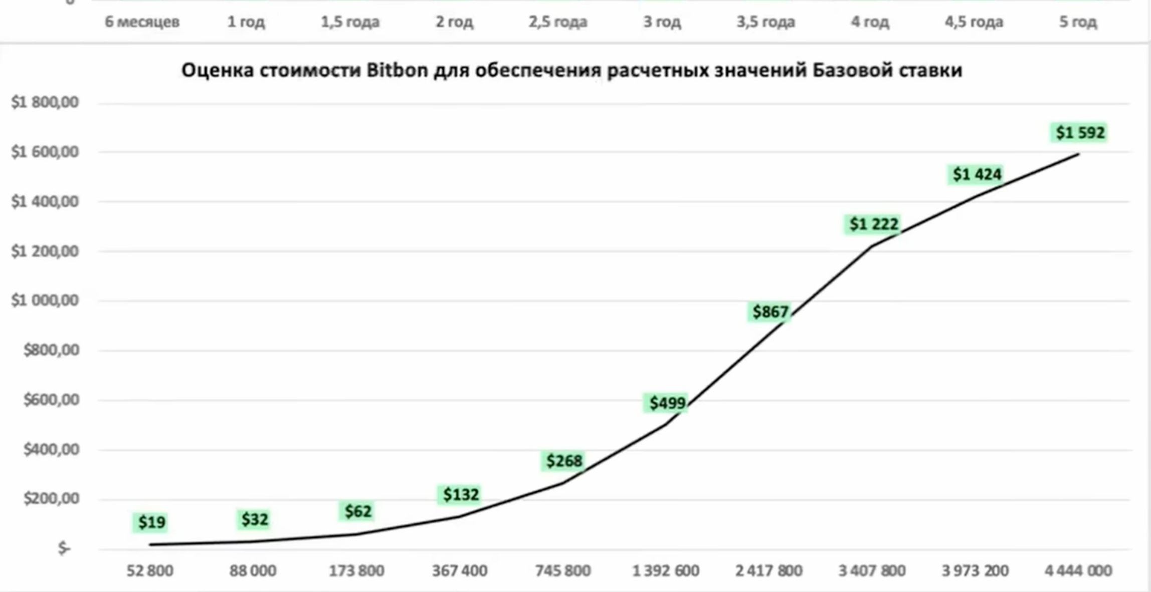 1 рік після комерційного страту - при 88,000 активних користувачів повинна бути не меншою ніж $32. (для того, щоб Bitbon не пішов у сильний дефіцит) При умові купівлі по $2 - це 1500% дохідності.