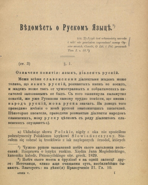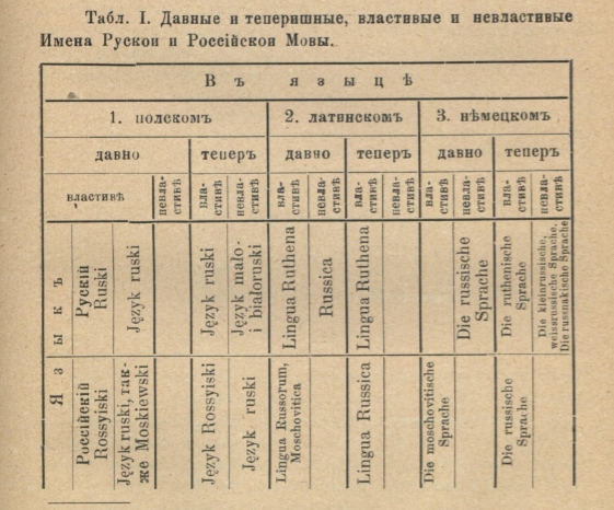 Перш за все він термінологічно розмежовує плутані «російську» та «руську» мови, пропонуючи «правильні» терміни та їх відповідники у інших мовах: 1) «языкъ рускій» (російською теж, але «малорускій» і «бѣлорускій» – відкидає, як «невластиві»), пол. «ięzyk ruski» («białoruski» і «małoruski» – відкидає, як «невластиві, лат. «lingua Ruthena», нім. «Ruthenische Sprache» (поняття «Russniakische Sprache» – теж «невластиве»; 2) «языкъ россійскій», пол. «ięzyk rossyiski», нім. «Russische Sprache», лат. «lingua Russica».