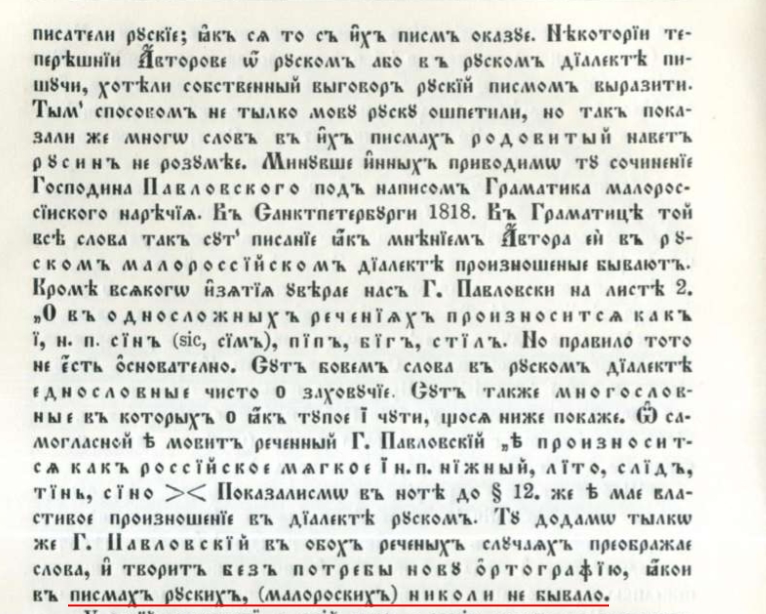 Він прямо заперечуватиме проти розділення цієї єдиної руської мови на білоруську та малоруську. Ця критика у самому правописі дістанеться і граматиці Павловського, яку він засуджував за етимологічне письмо, до того ж неточне: