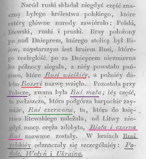 Цьому підтвердженням може слугувати і те, що II розділ, де йдеться про історію русинів, він розпочинає з твердження, що «Рускій народь складаль знакомиту часть бывшого Королевства Полского», а «Королевство Полское» складали три народи: польський, литовський і руський. Середньовічна Русь була поділена на північну та південну частини, або ж на Велику і Малу. «Знакомита частина» Малої, або ж Червона Русь, залишилась під владою галицьких князів до завоювання поляками. Проте це не всі південноруські землі. Згодом до Польщі разом з Литвою увійшли Україна, Поділля, Волинь, а також Біла і Чорна Русі, завойовані литовцями. У подальшому він наводить чимало привілеїв польсько-литовської доби [4, с. 30-32].