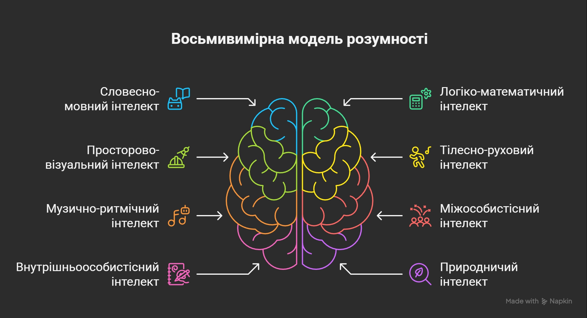Для старшокласників, які обирають професію, це критично. Архітектору потрібен просторовий інтелект. Психологу — міжособистісний. Програмісту — логічний + просторовий. Підприємцю — комбінація 4-5 типів.