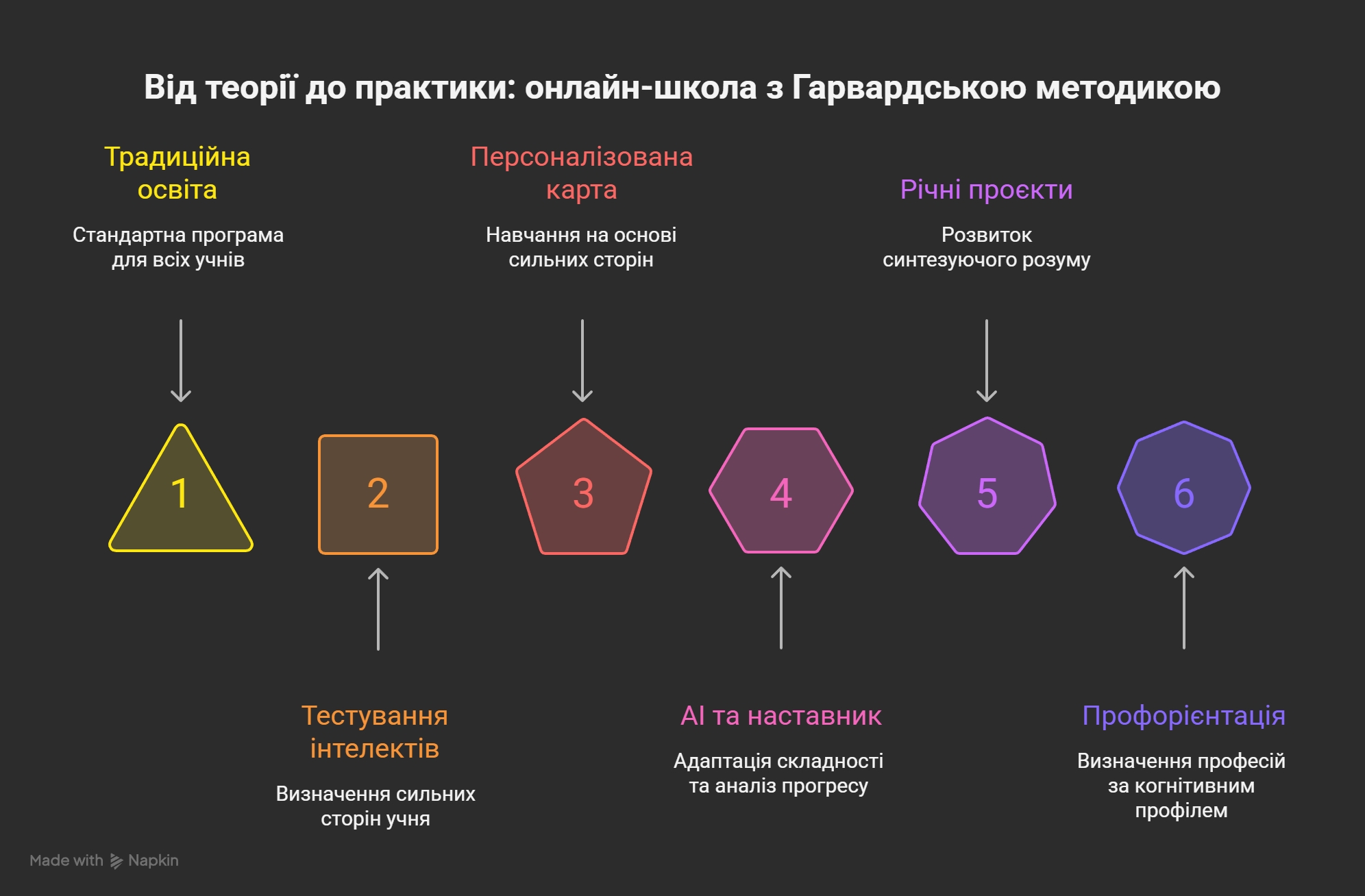 Персоналізована "дорожня карта": навчання будується на сильних сторонах. Музичний інтелект? Можна вчити історію через музику епох. Тілесний? Хімічні експерименти своїми руками.