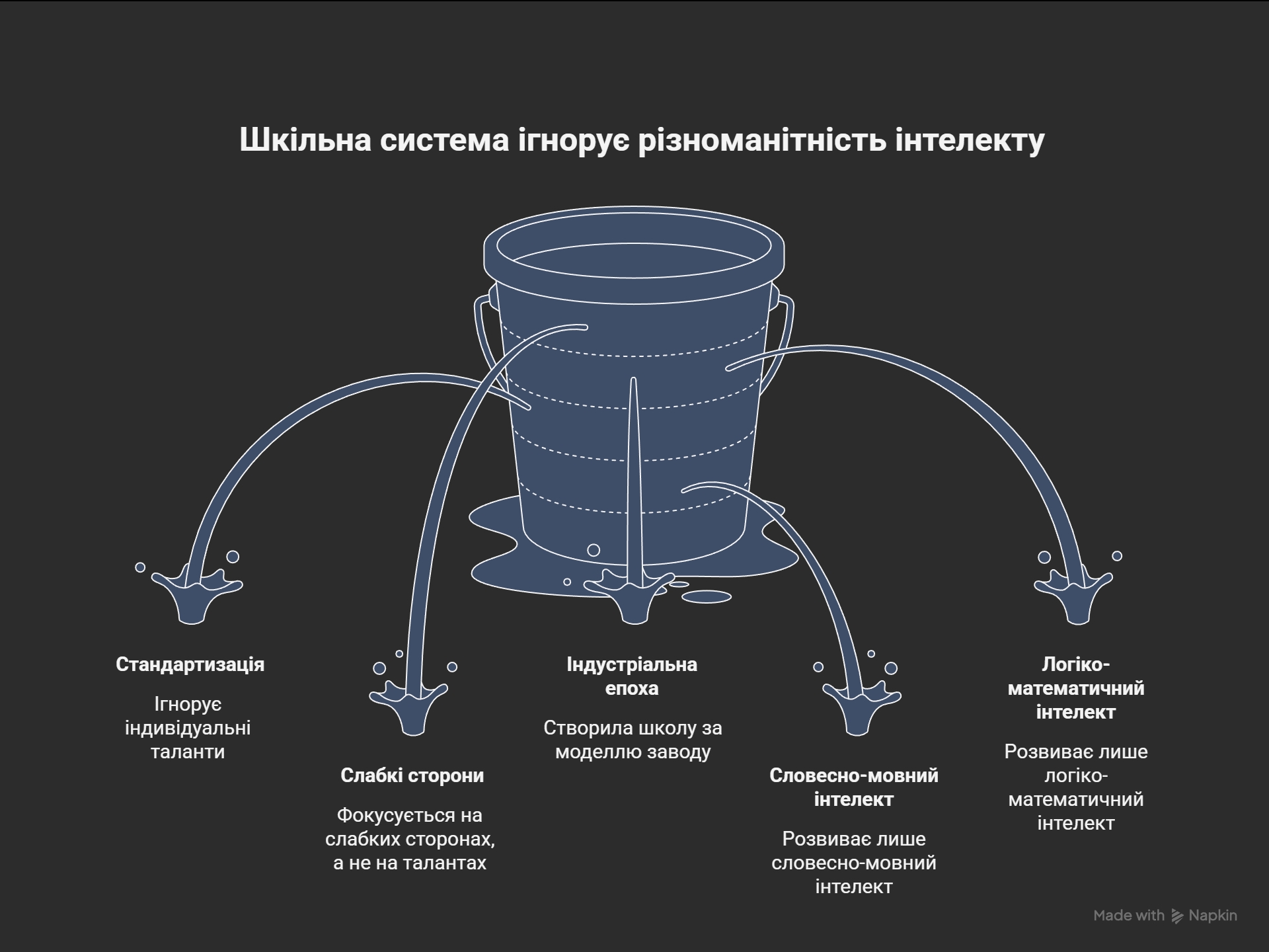 Індустріальна епоха створила школу за моделлю заводу: стандартизація, конвеєр, масовість. Заводам потрібні були люди з двома навичками — читати інструкції та рахувати деталі. Тому школа розвивала лише словесно-мовний та логіко-математичний інтелекти.