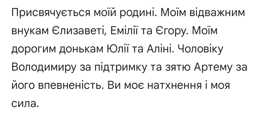 Моя родина розсіяна по світу, але ми всі під вільним небом. Донька Юлія та внучка Єлизавета знайшли свій дім у Нідерландах. Ліза вже досконало знає нідерландську і успішно ходить до школи, а Юля працює і наполегливо вчить мову. Артем та Аліна зараз у США — вони будують своє майбутнє, працюють і вчаться, доводячи, що наш рід неможливо зламати.