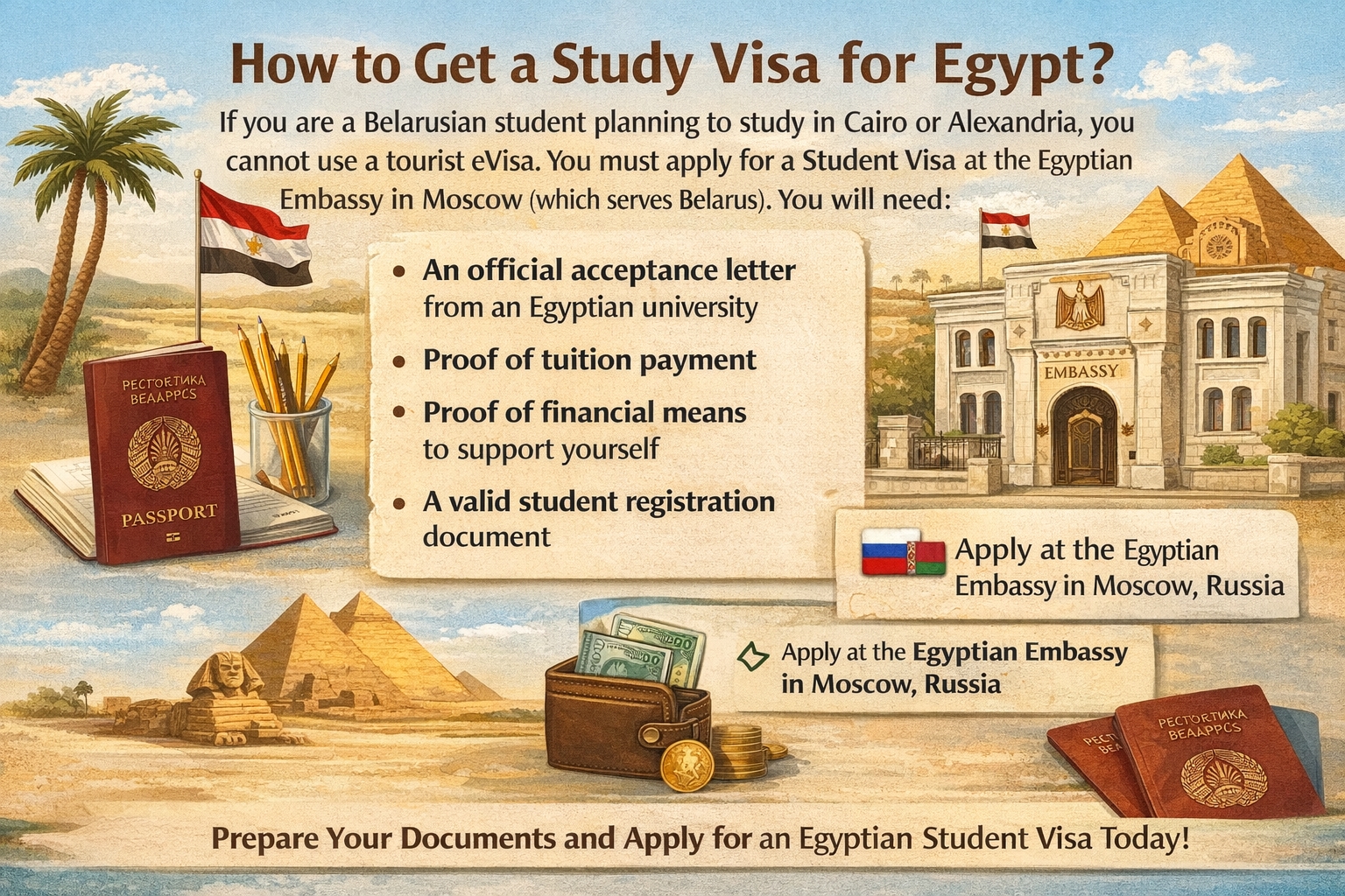 If you are a Belarusian student planning to study in Cairo or Alexandria, you cannot use a tourist eVisa. You must apply for a Student Visa at the Egyptian Embassy in Moscow (which serves Belarus). You will need: