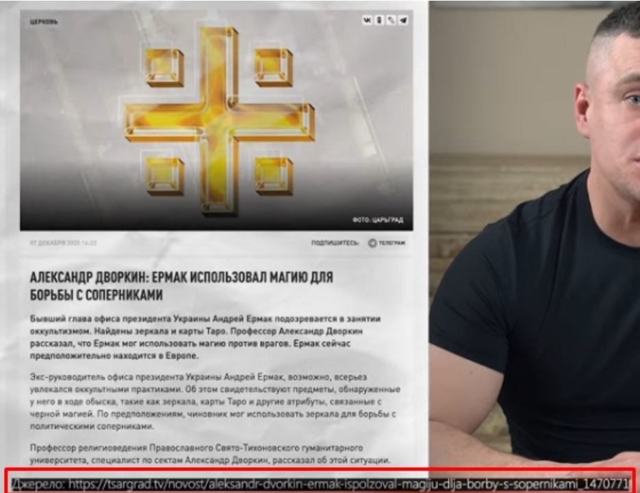 Не вважаю це збігом обставин. Але сам Дворкін написав ідентичну статтю ще 7 грудня 2025 р.: "Єрмак использовал магию для борьбы с соперниками". Такою цитатою Дворкін робить тупо вкид про окультизм у владі, де без жодних доказів стверджується, що Андрій Єрмак нібито займався магією, використовував дзеркала, таро, вуду і ритуали проти ворогів.