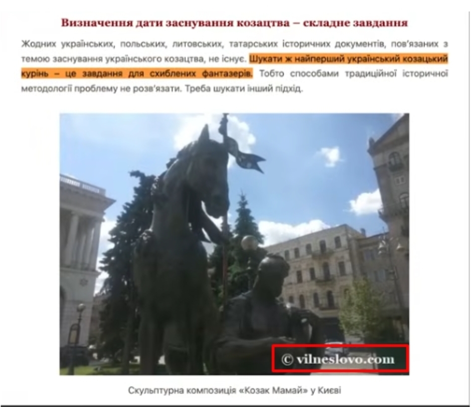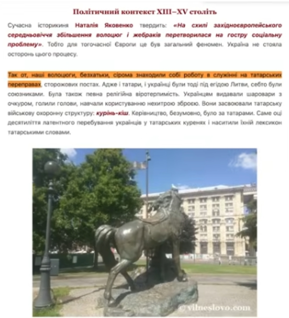 Цитата зі скрина: «Українського окремого козацтва не існувало. Було татарське козацтво. А тут українські козаки, як перевертні, набралися всього ворожого татарського».