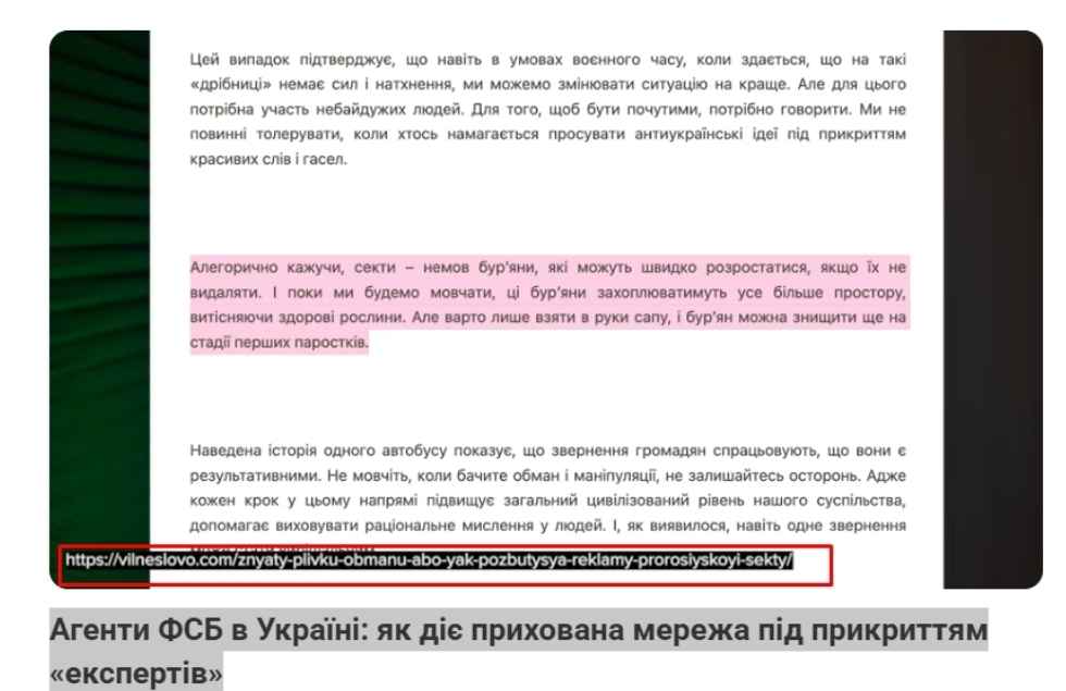 Цитата зі скрина: “Алегорично кажучи, секти немов бур'яни, які можуть швидко розростатися, якщо їх не видаляти. І поки ми будемо мовчати, ці бур'яни захоплюватимуть усе більше простору, витісняючи здорові рослини. Але варто лише взяти в руки сапу і бур'ян можна знищити ще на стадії перших паростків”.