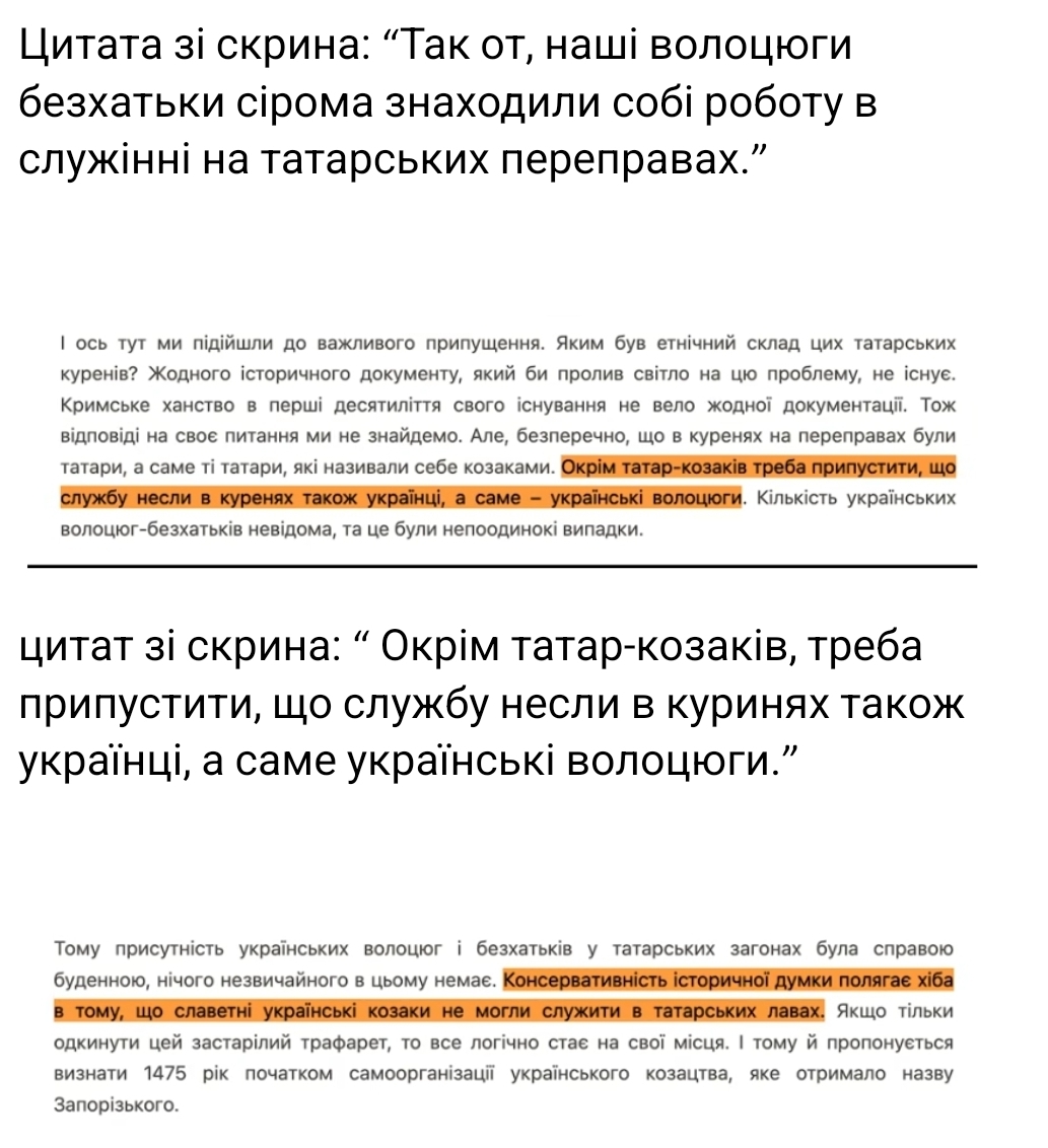 Цитата зі скрина:«Так от, наші волоцюги, безхатьки, сірома знаходили собі роботу в служінні на татарських переправах».