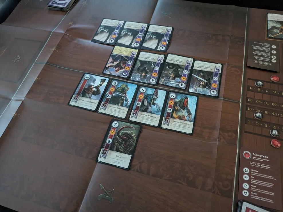 Ваш ігровий стіл поділений на три ряди — для ближнього бою, дальнього бою та облогових загонів. Більшість карт мають символ, що вказує, у який ряд їх потрібно викладати. Розіграш карти зазвичай зводиться до того, щоб покласти її у позначений ряд. Такі карти, як правило, мають значення сили, яке додається до загальної сили на полі. Це триває доти, доки один із гравців не вирішить "пасувати", після чого його суперник може продовжувати викладати карти, доки теж не вирішить пасувати. Потім гравець із найбільшою сумою сили виграє раунд.