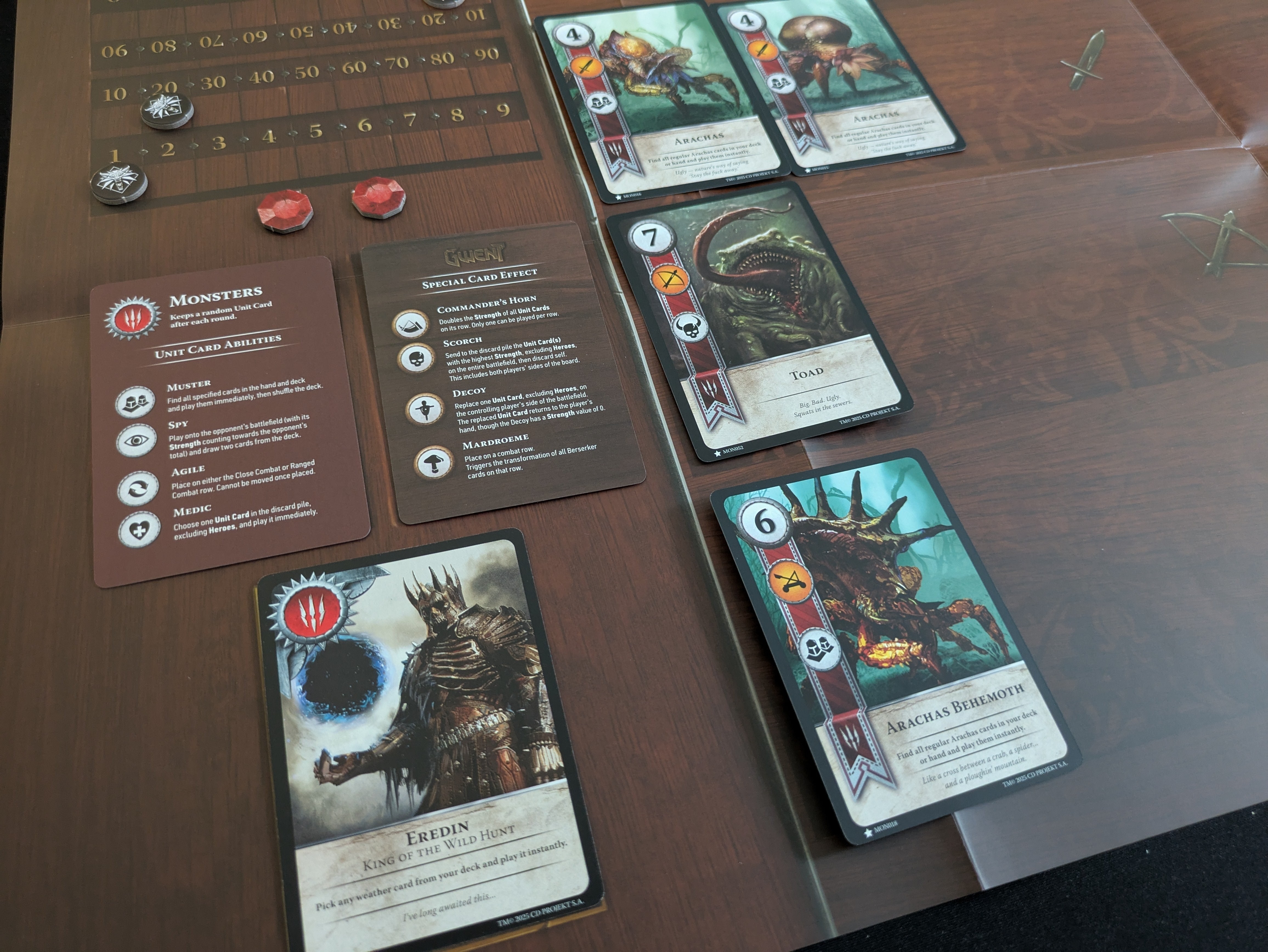 Окрім карт загонів, існують різні категорії спеціальних карт. Найпростіші у використанні — карти героїв, які в основному поводяться так само, як загони, але мають імунітет до спеціальних здібностей, тому їх важче знищити. Карти погоди викладаються на бічну частину ігрового поля і впливають на обидві сторони, знижуючи силу всіх карт (крім карт героїв) в одній із трьох областей до одиниці. Це може призвести до великих коливань, як і деякі інші спеціальні карти, такі як «Командирський ріг», що подвоює силу всіх карт у своєму ряду, або «Спалення», яка відправляє карти з найбільшою силою на полі до кладовища. Вони додають ще більше напруги й очікування до механіки «пасувати чи грати далі», а також забезпечують тактичний простір для маневру. Якщо суперник викладає карти дальнього бою, а у вас є карта погоди «Туман», що знижує силу цього ряду до 1, ви можете приберегти власні карти дальнього бою на наступний раунд і підготувати неприємний сюрприз.