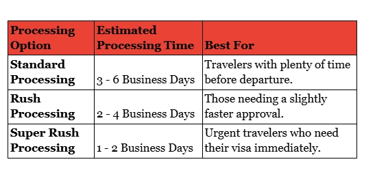 The eVisa system offers different processing speeds to accommodate various travel schedules: