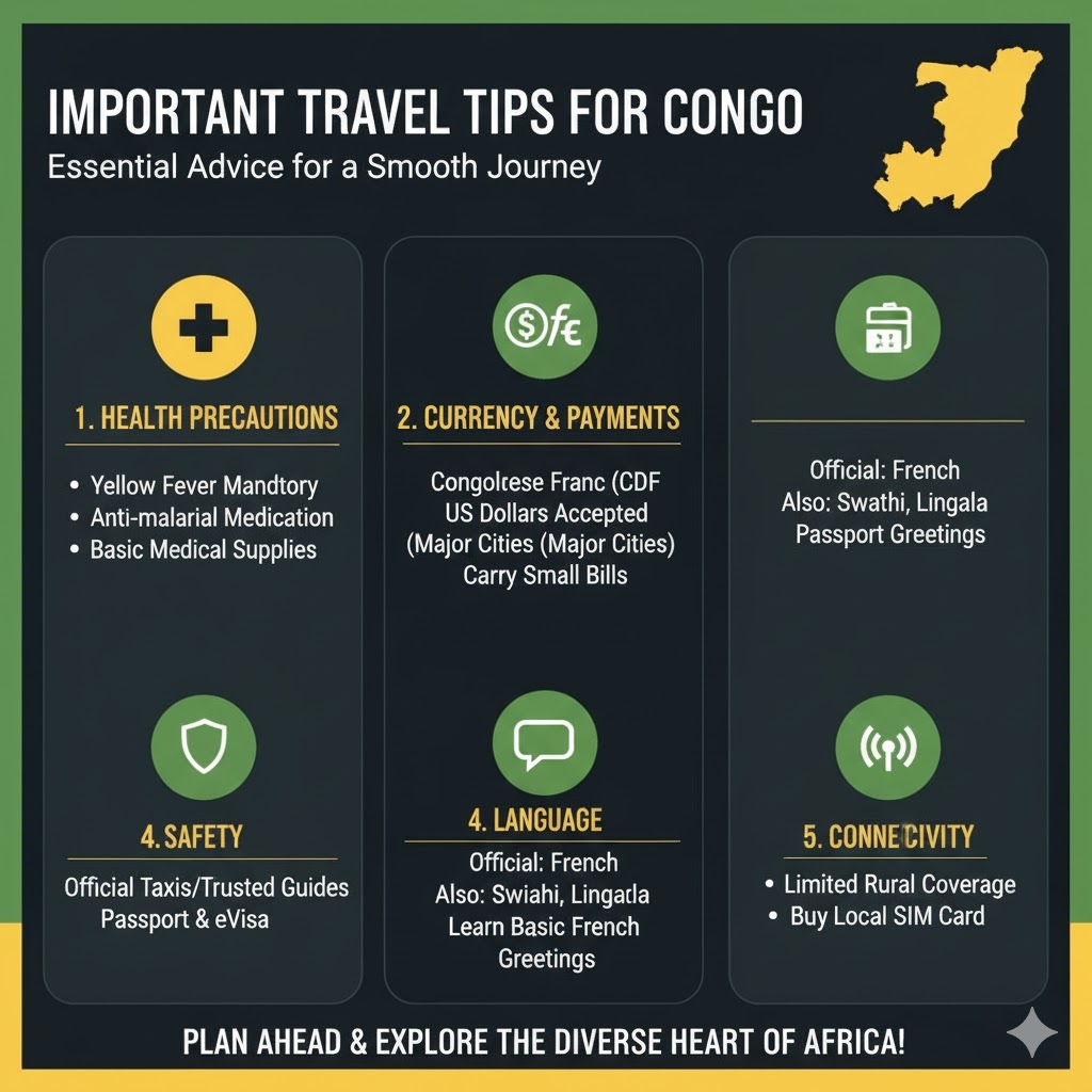 Stick to official taxis or trusted guides, especially in Kinshasa and Goma. Always keep copies of your passport and eVisa handy.