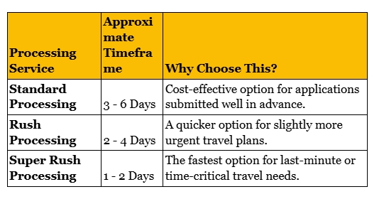 Note: Processing times are estimates and do not include weekends or public holidays. It is always recommended to apply well in advance of your intended travel date to account for any potential delays or requests for additional documentation.