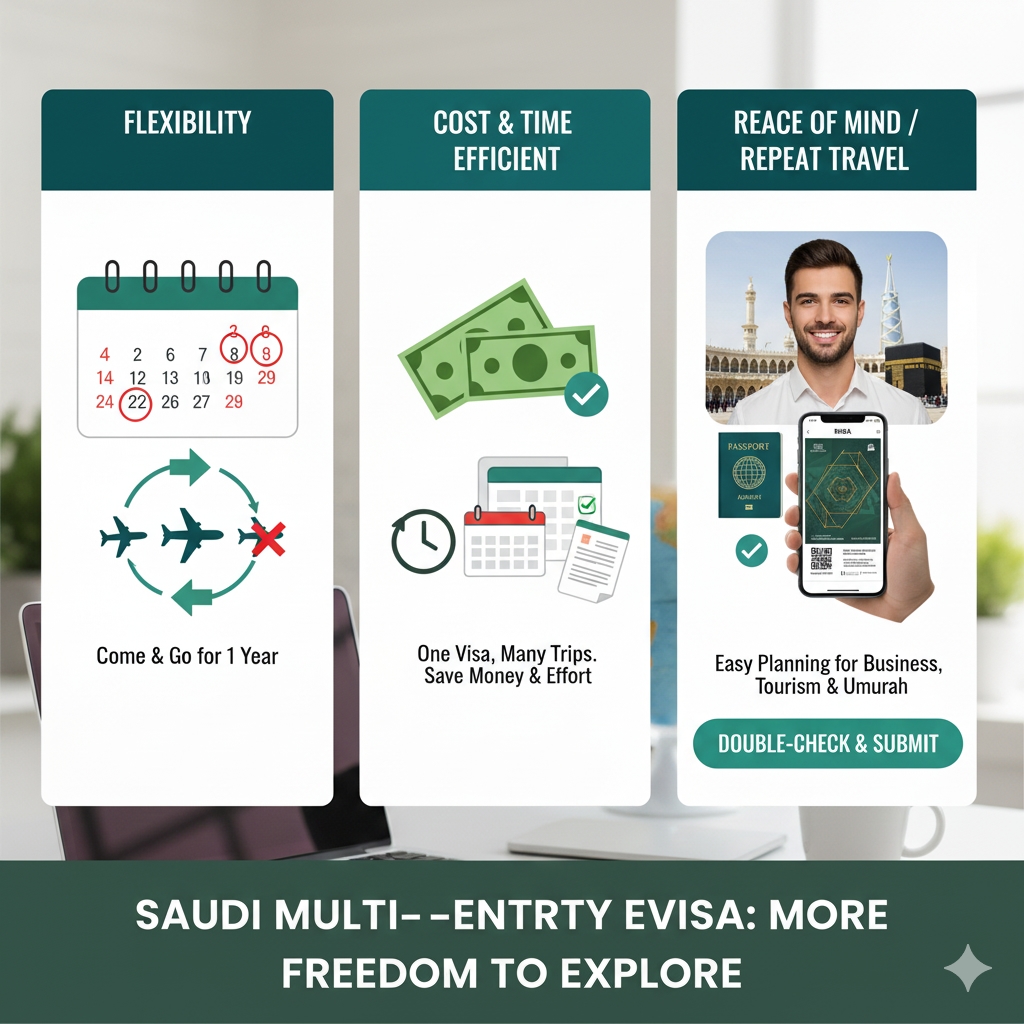 Better for Repeat Travelers: If you plan to travel more than once (for business, Umrah, or tourism), you don’t need to reapply for every trip.