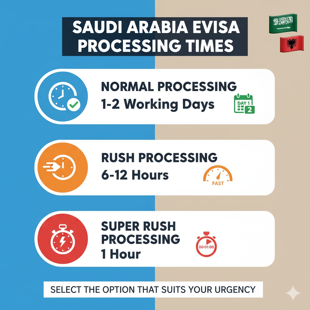 Select the processing time that best suits your needs and urgency. If you're in a hurry, choosing the Saudi Arabia Urgent Visa option ensures you receive your results within the fastest available time frame. Each option comes with its respective timeline to help you plan with confidence.