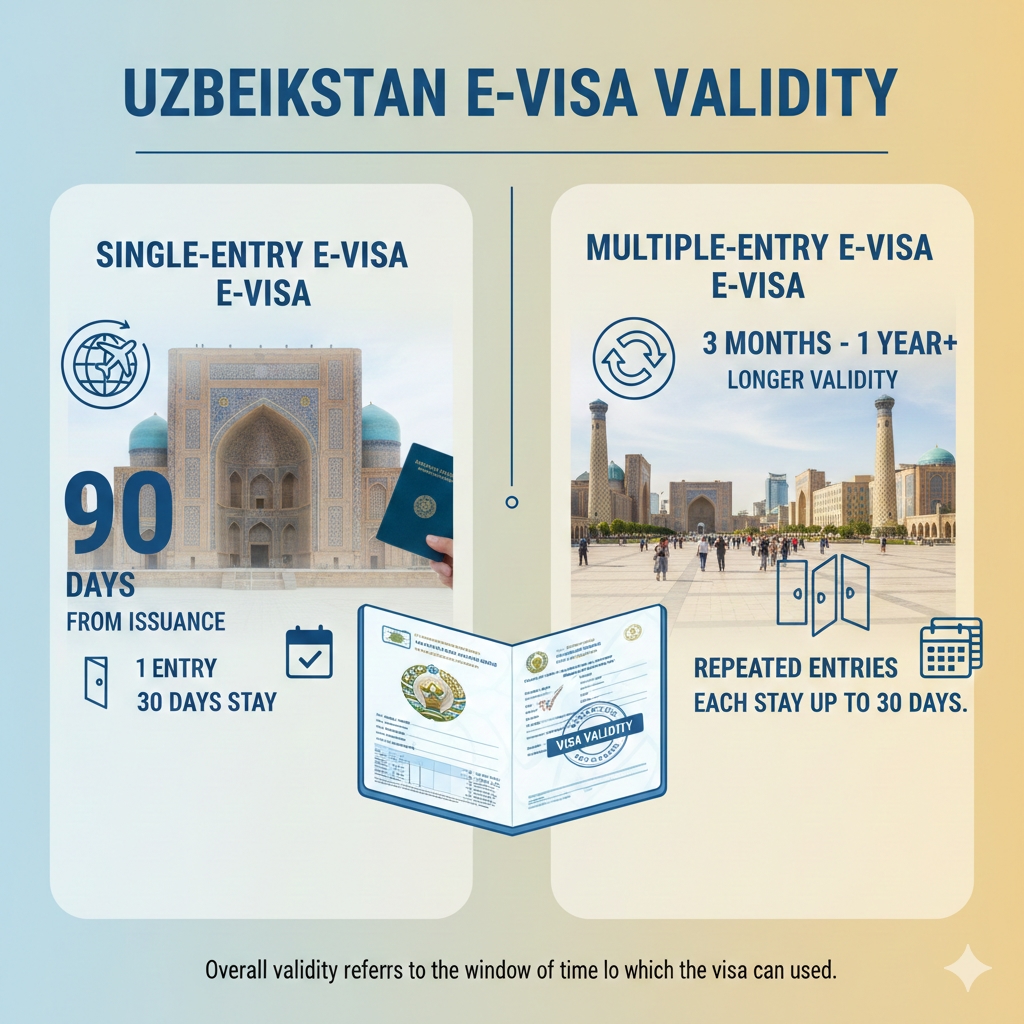 Single-Entry Visa: Grants permission to enter Uzbekistan one time only during the visa's period of validity. Once you leave the country, the visa is considered used, even if you did not stay for the full allowed duration. You would need to apply for a brand new visa to re-enter.