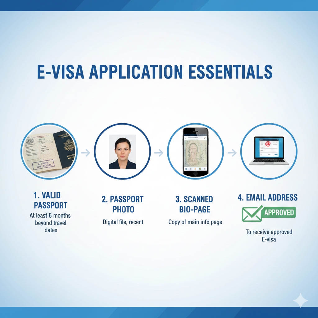 The basic documentation required for a tourist E-Visa application is generally the same, regardless of the entry type: