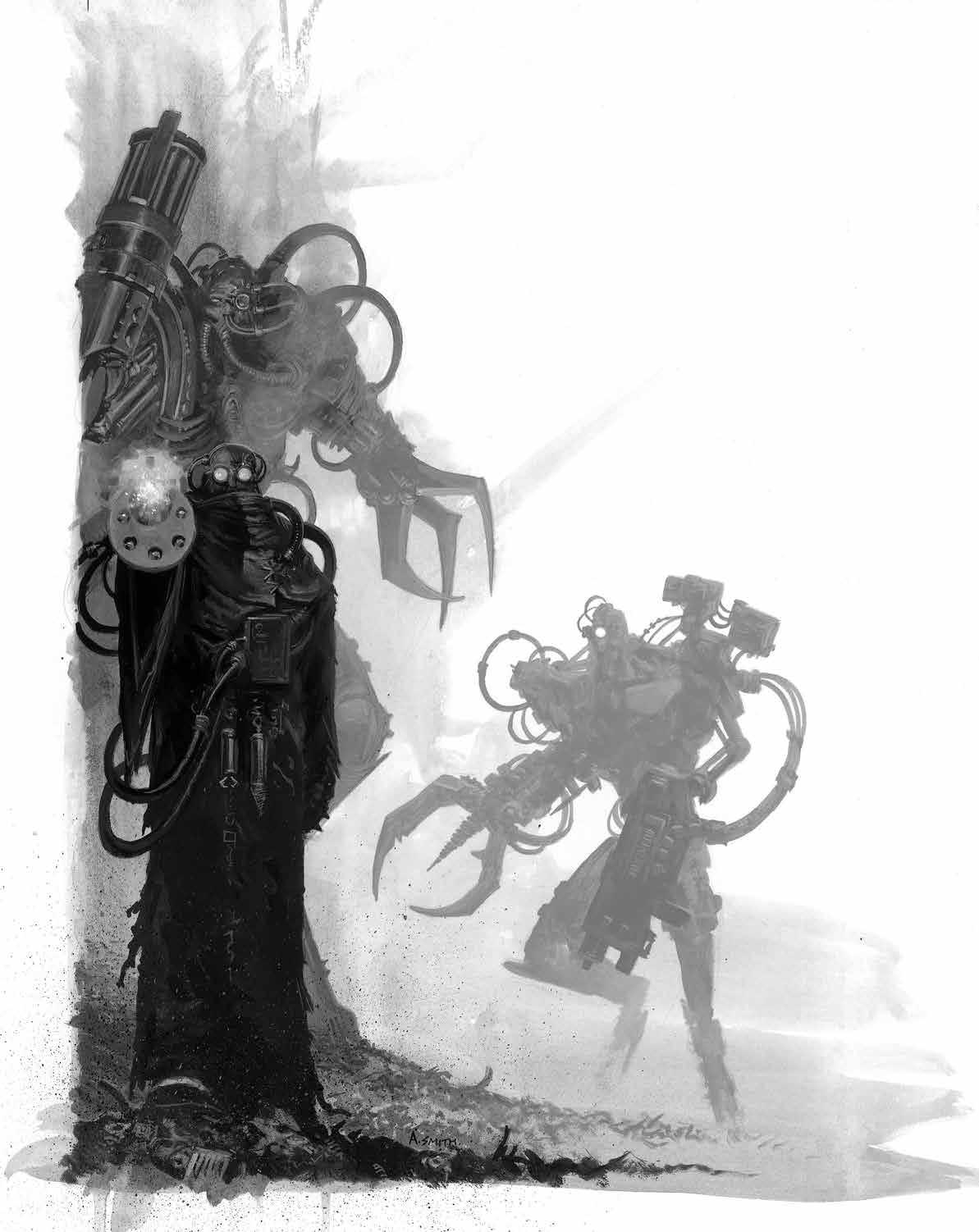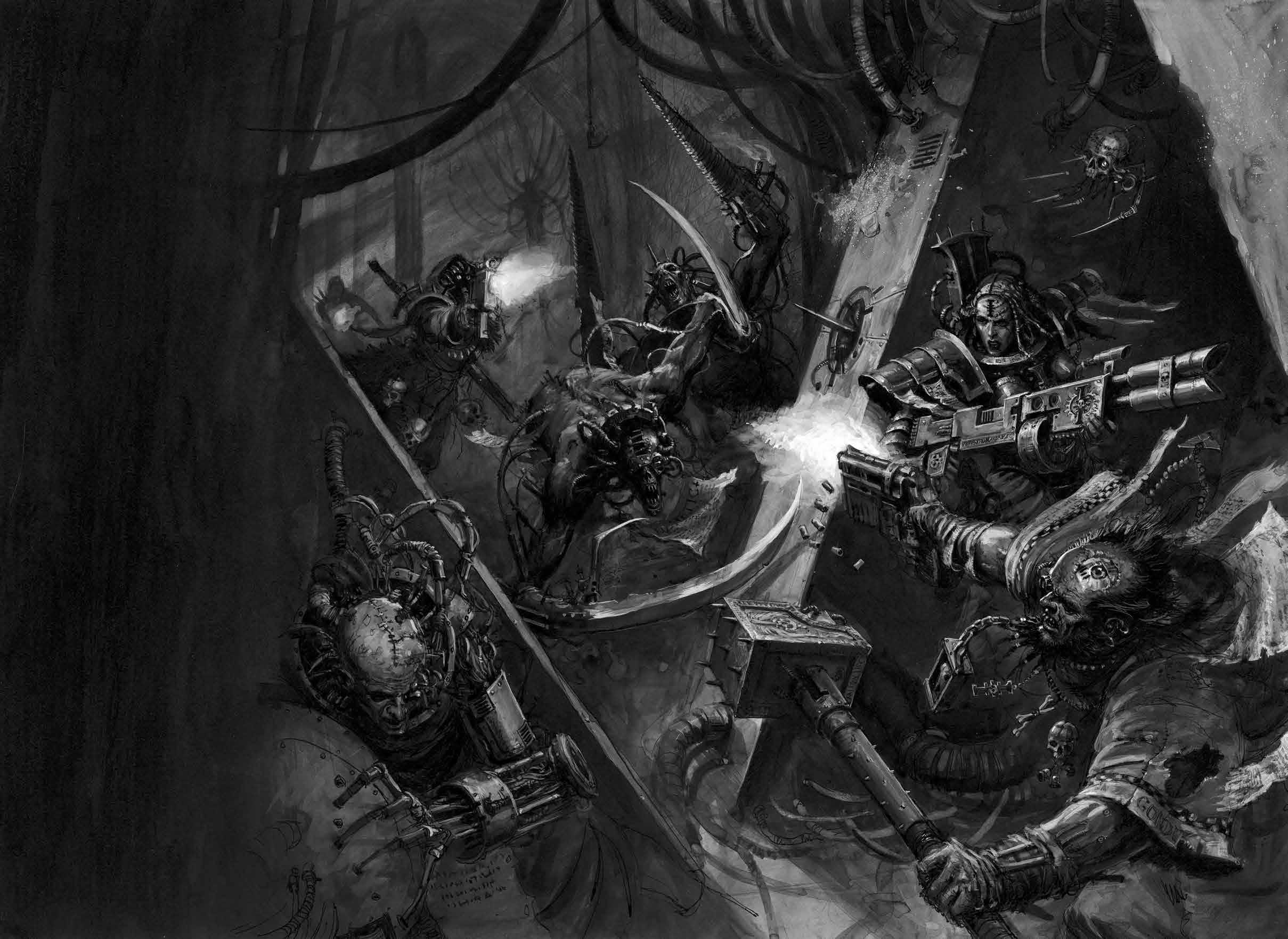 Крізь двері протупотіли двійко велетенських потвор з плоті та металу – бойові сервітори, на голову вищі за Корона й обвішані клинками та вогнепальною зброєю.