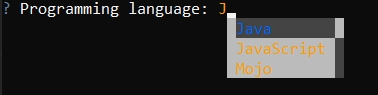 quest.autocomplete("Programming language:", languages).ask()