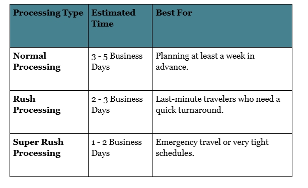 Timing is everything when planning an international trip. Depending on how close you are to your departure date, you can choose from three processing speeds: