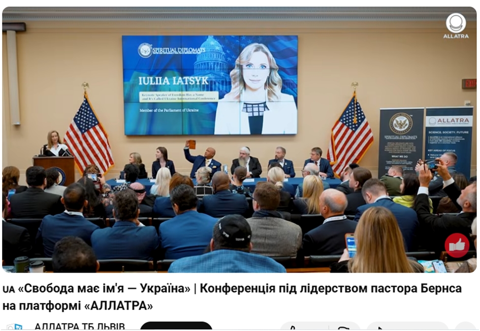 Народна депутатка України, паніЮліюЯцик у своїйдоповіді у Вашингтоні на масштабнійміжнароднійконференції «Cвободамаєім'я — Україна», яку булоорганізованопідкерівництвом пастора Марка Бернса, духовного радника Президента США Дональда Трампа, та йогоглобальноїініціативи «Духовнідипломати» на платформіМіжнародногогромадського руху «АЛЛАТРА», промовила: