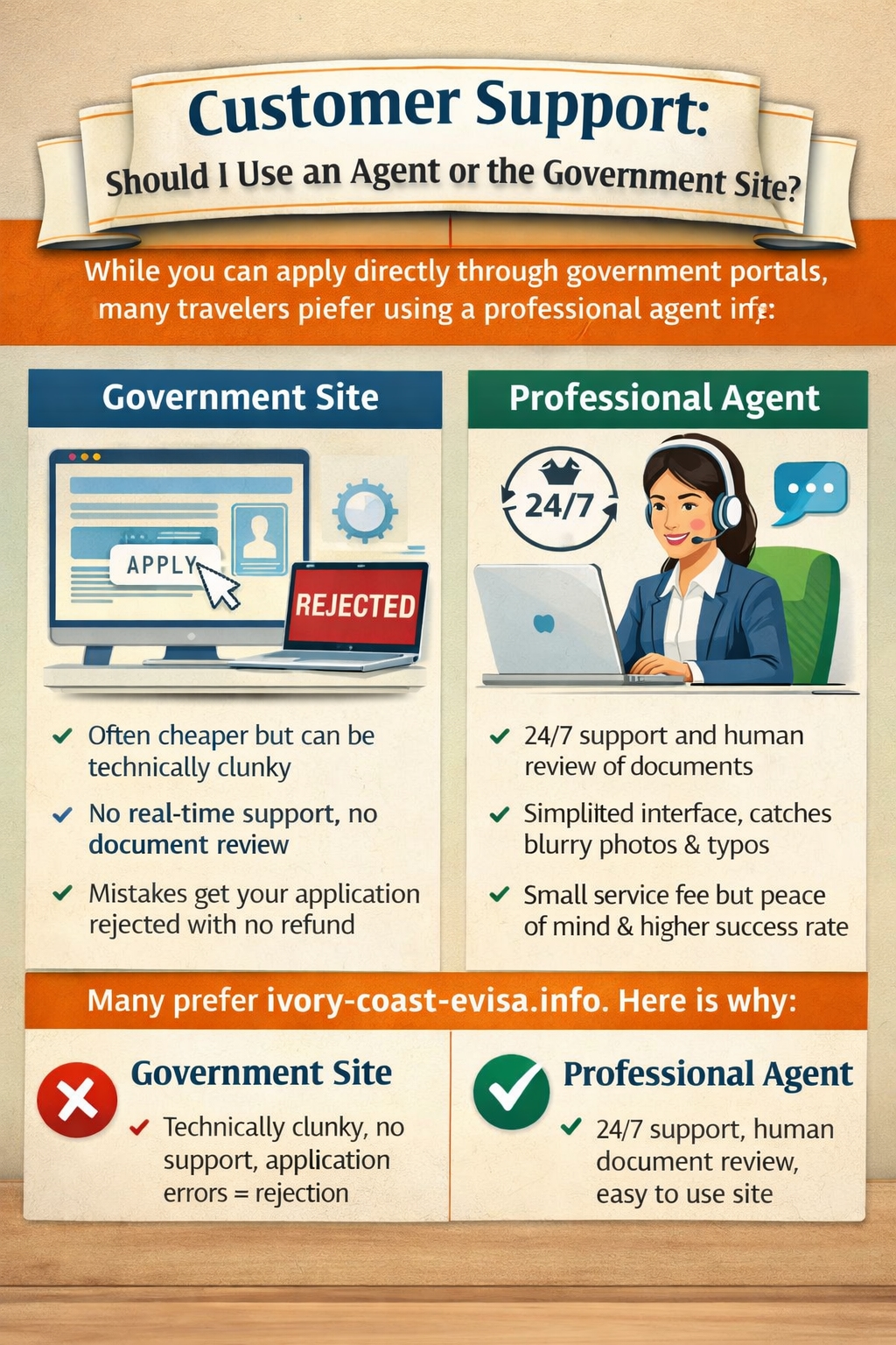 While you can apply directly through government portals, many travelers prefer using a professional agent like ivory-coast-evisa.info. Here is why: