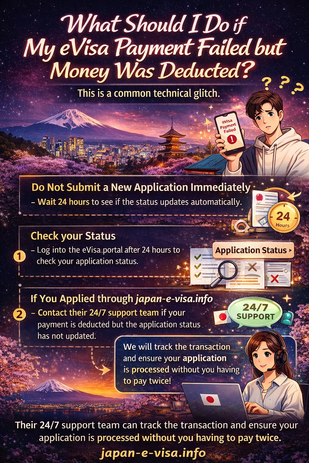 This is a common technical glitch. If your payment failed on the portal but the money left your account, do not submit a new application immediately. Wait 24 hours to see if the status updates. If you applied through japan-e-visa.info, their 24/7 support team can track the transaction and ensure your application is processed without you having to pay twice.